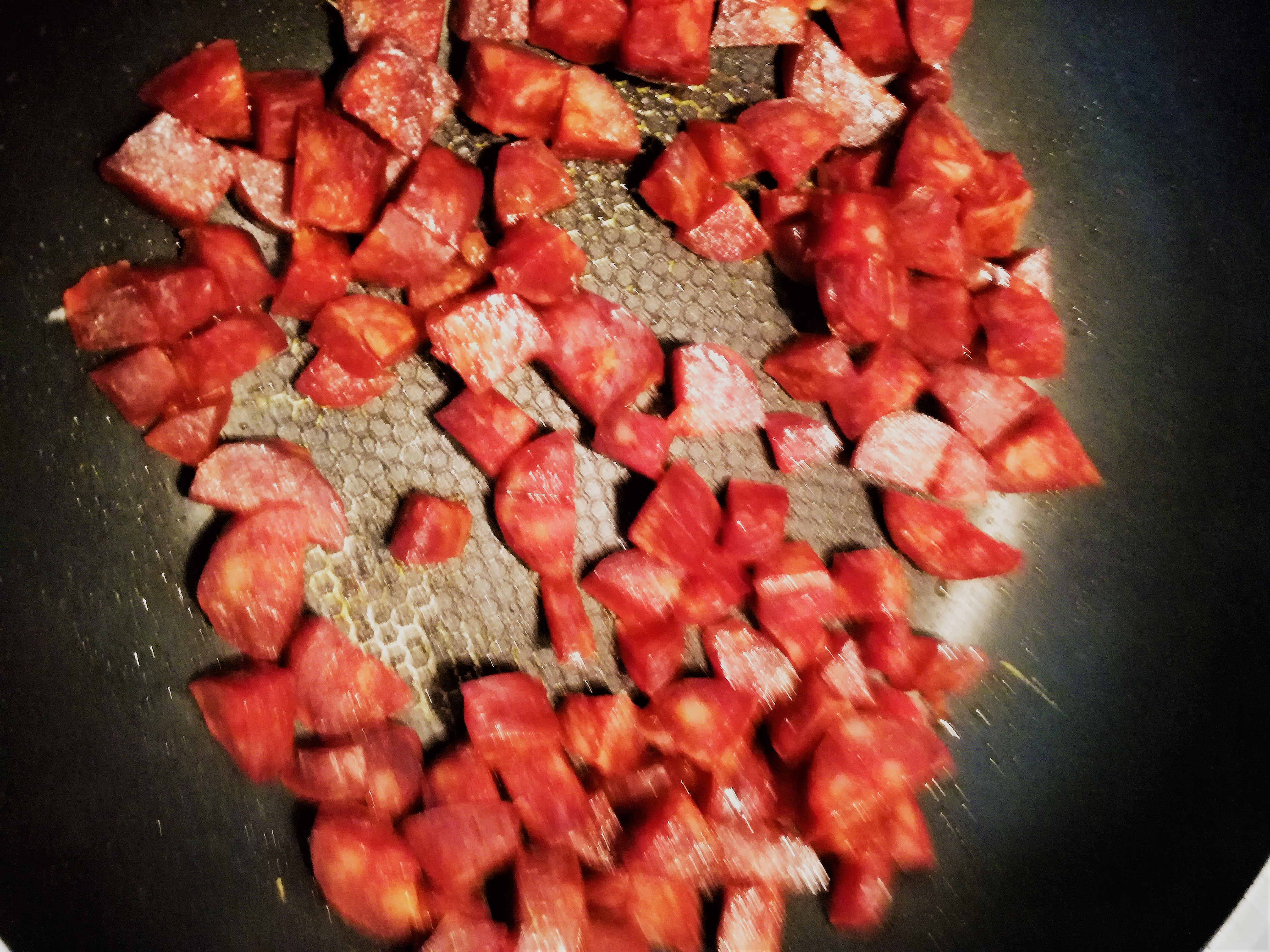 - snij de chorizo in kleine stukjes en bak in de pan (zonder vet!)
