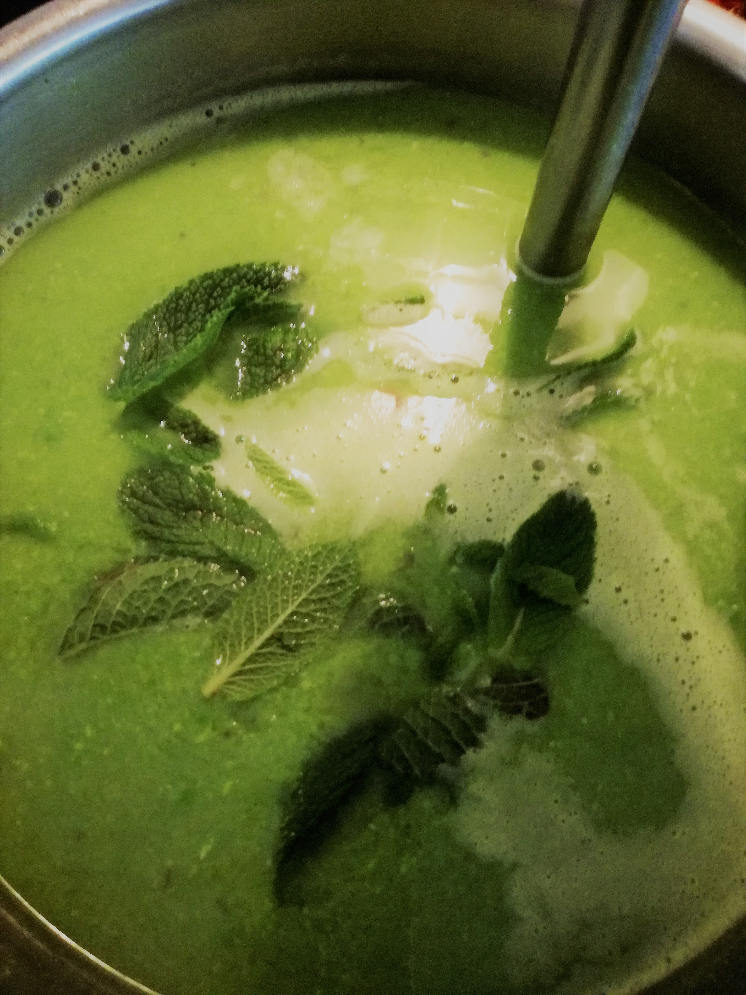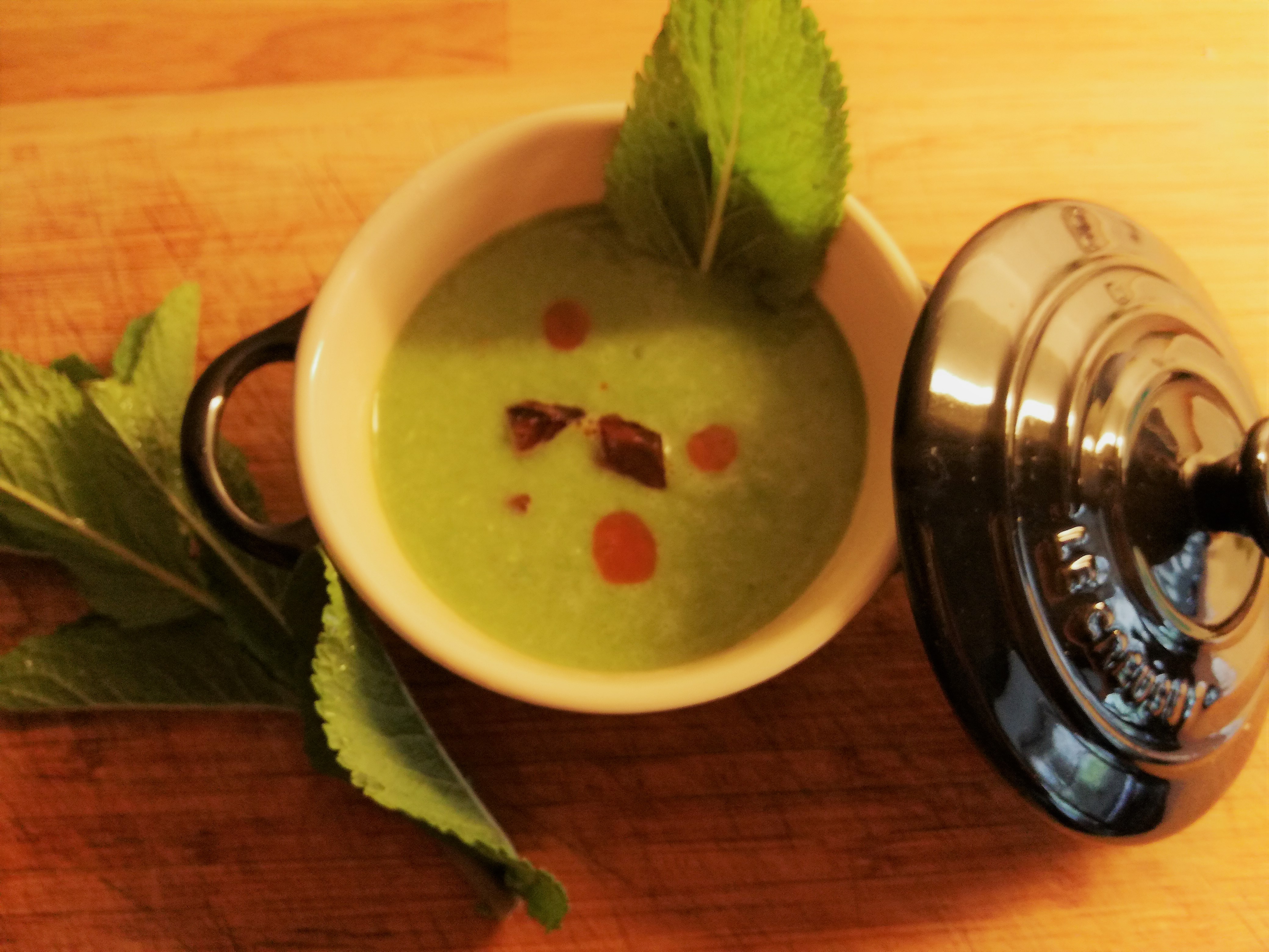 - pureer de soep en voeg een 10-tal muntblaadjes toe