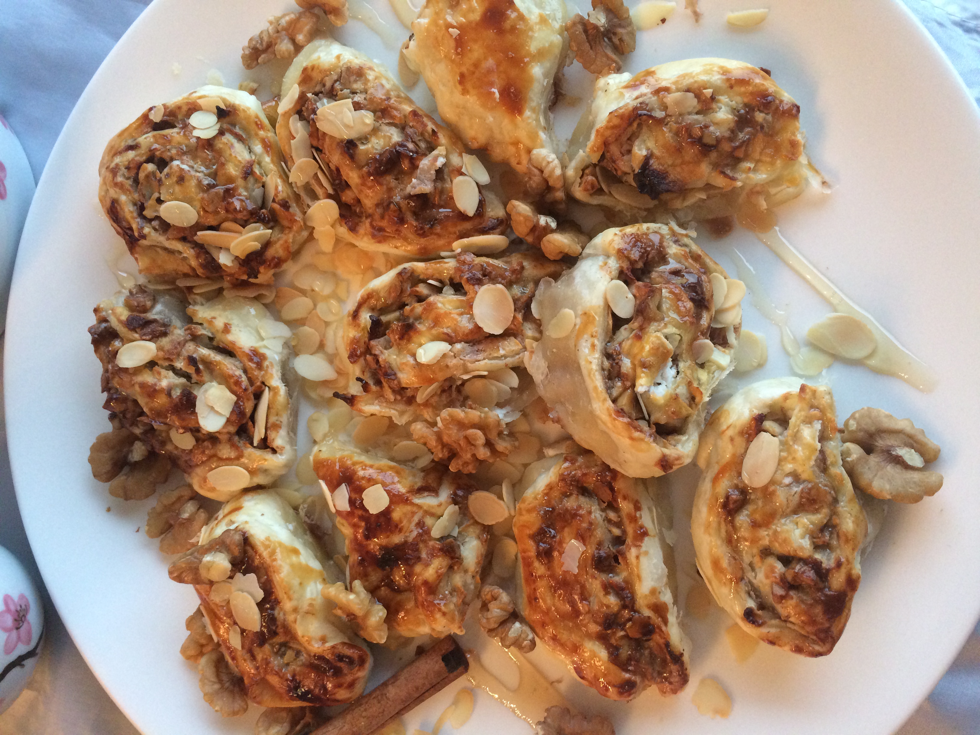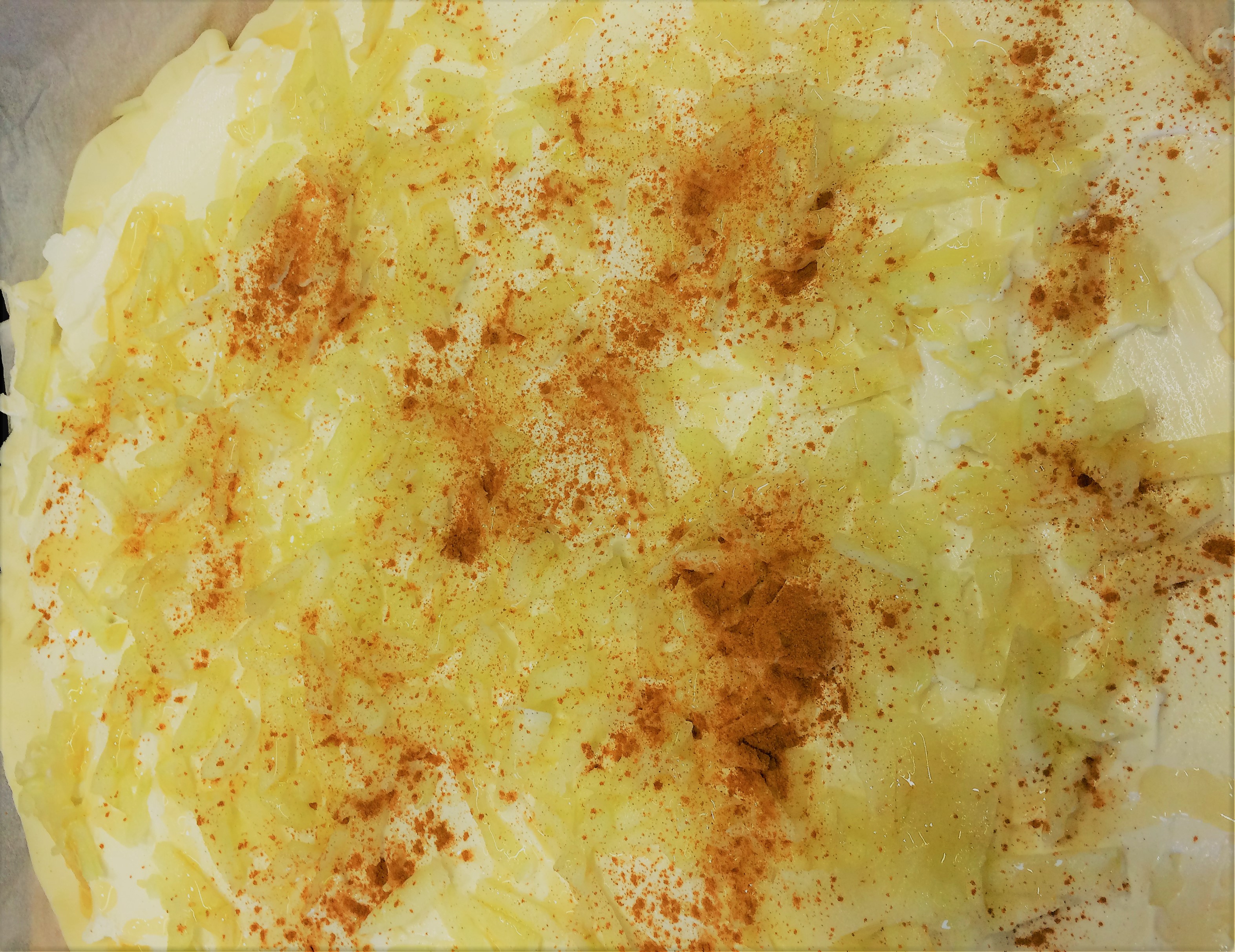 - verdeel de appel over het deeg, bestrooi met kaneelpoeder en bedruip met honing