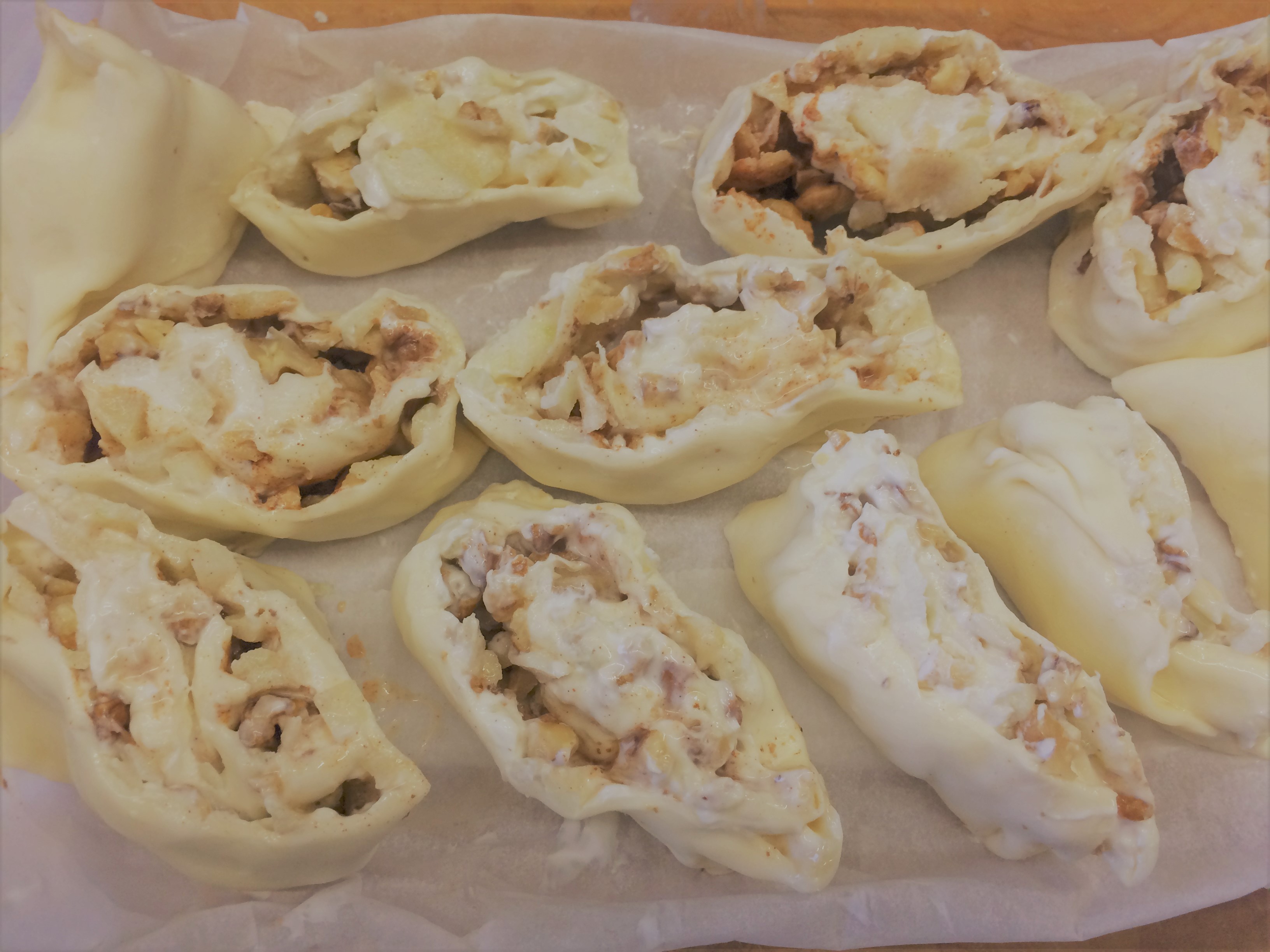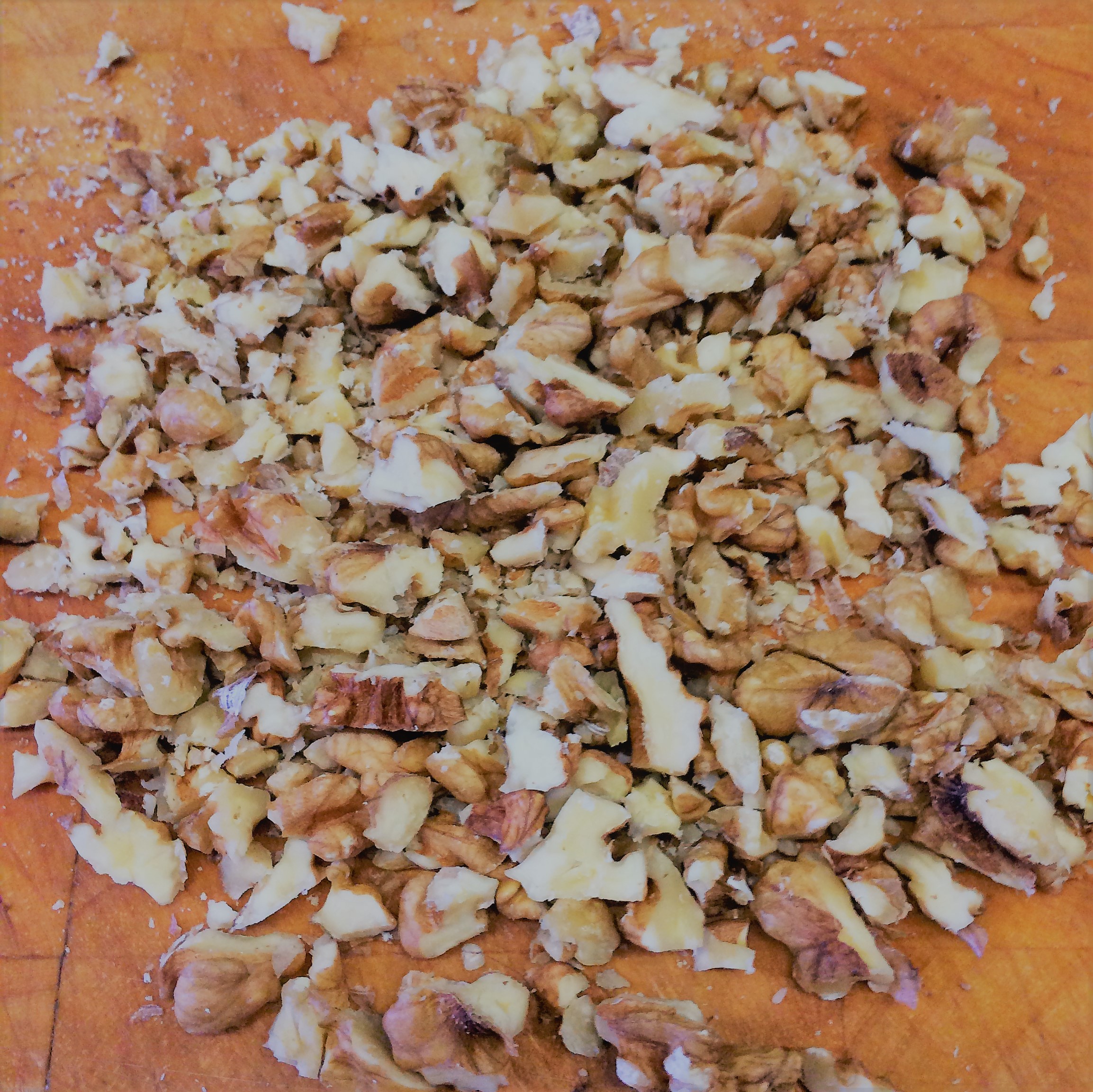 - hak de walnoten in stukjes en verdeel over het deeg