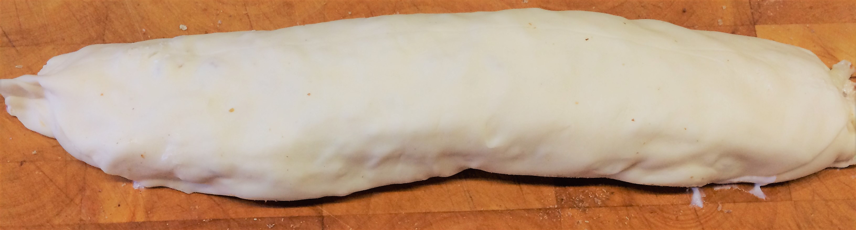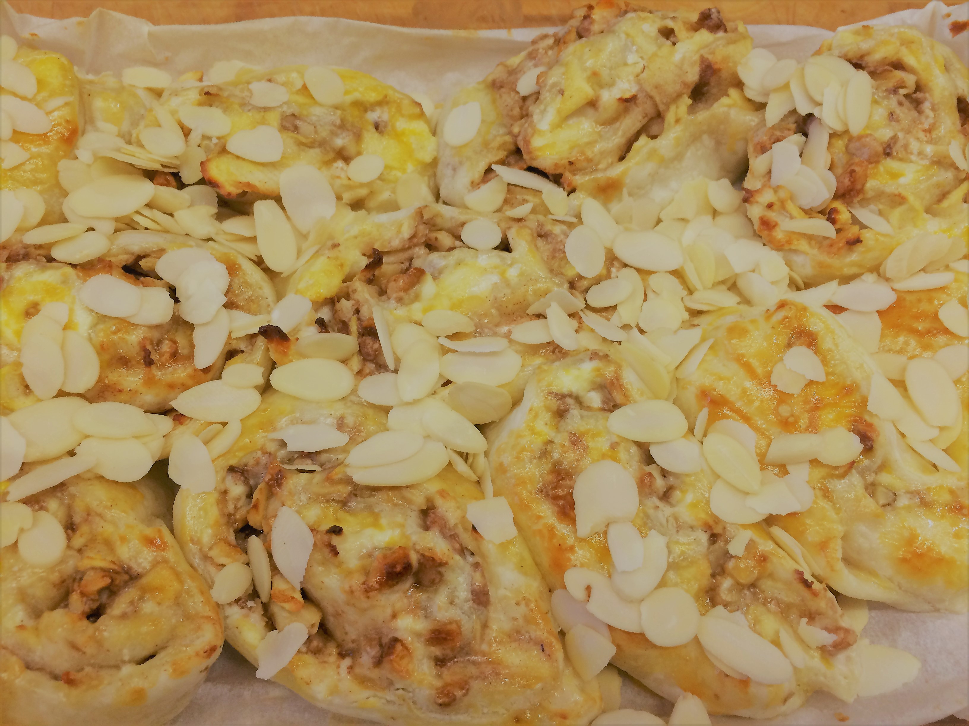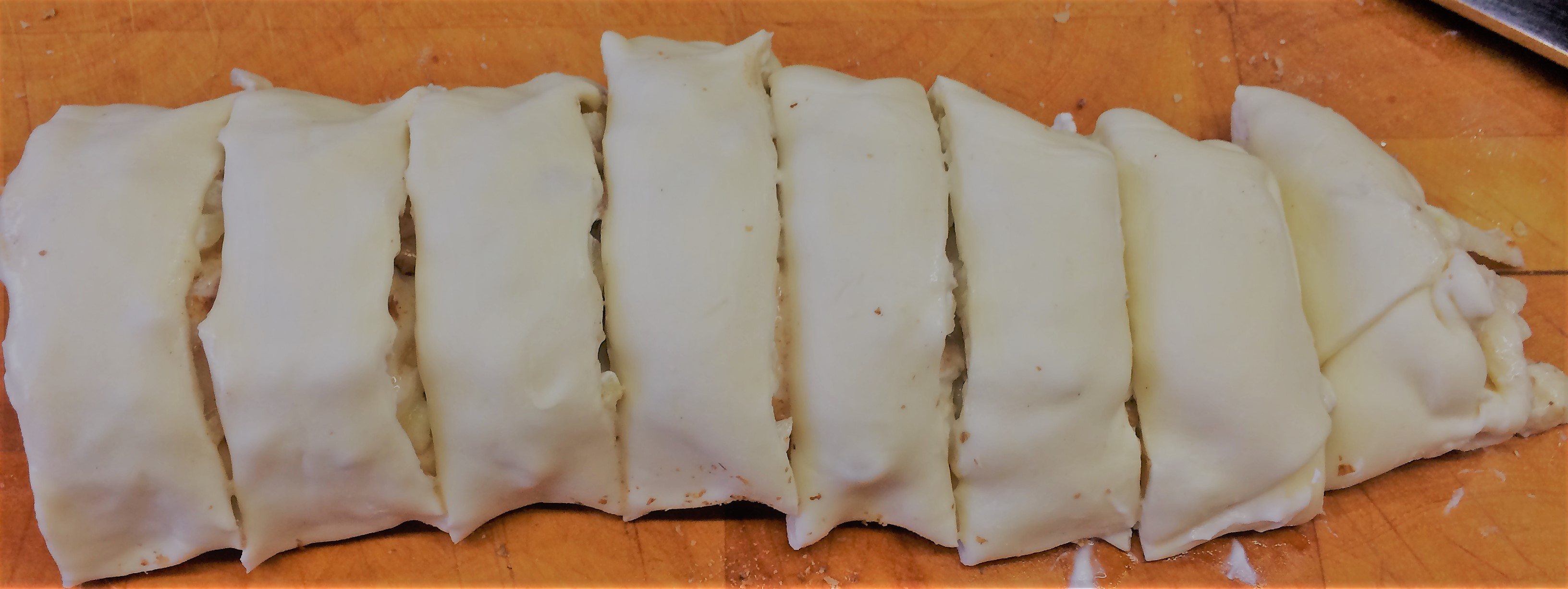 - rol het deeg op in een worst, snij in sneden en leg in een ovenschaal