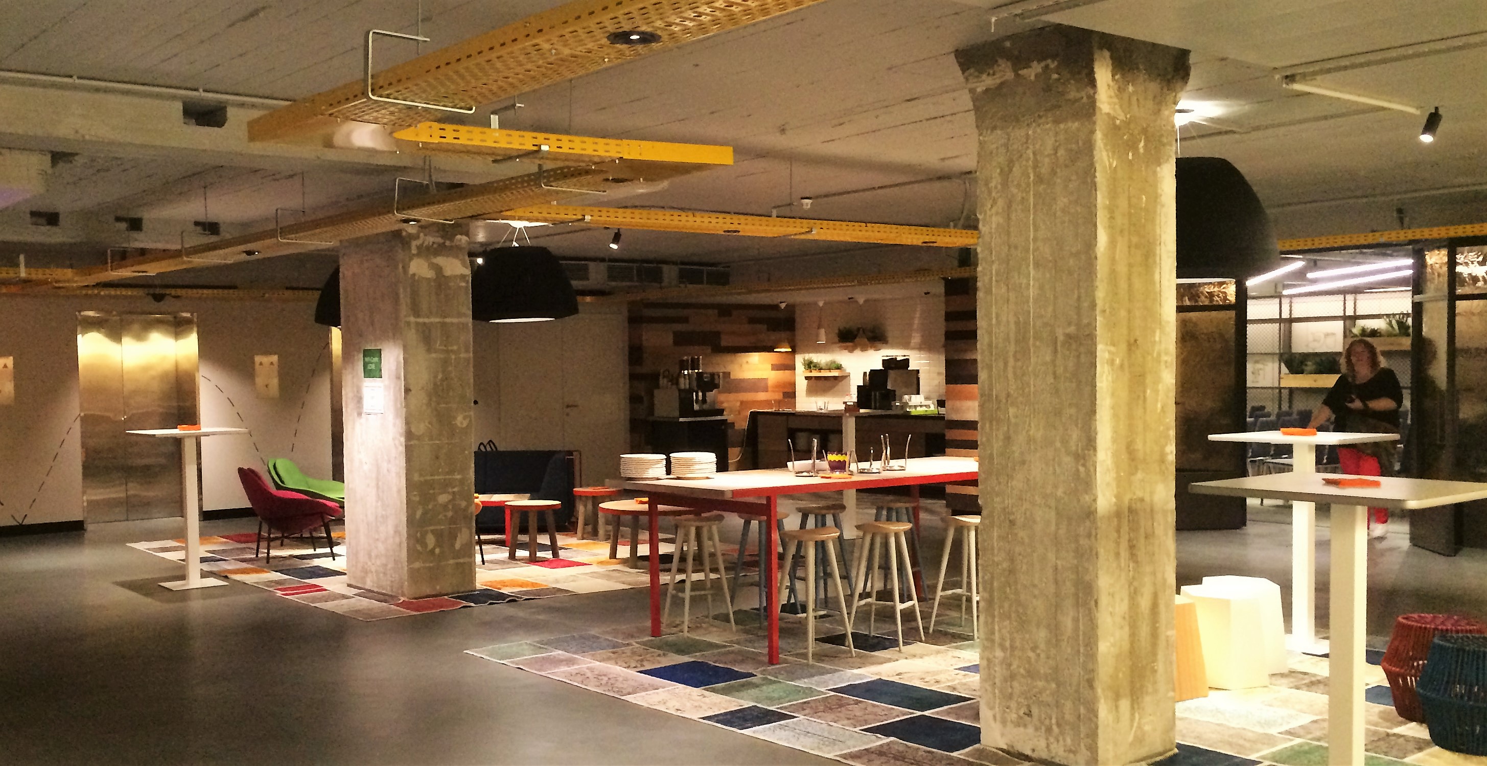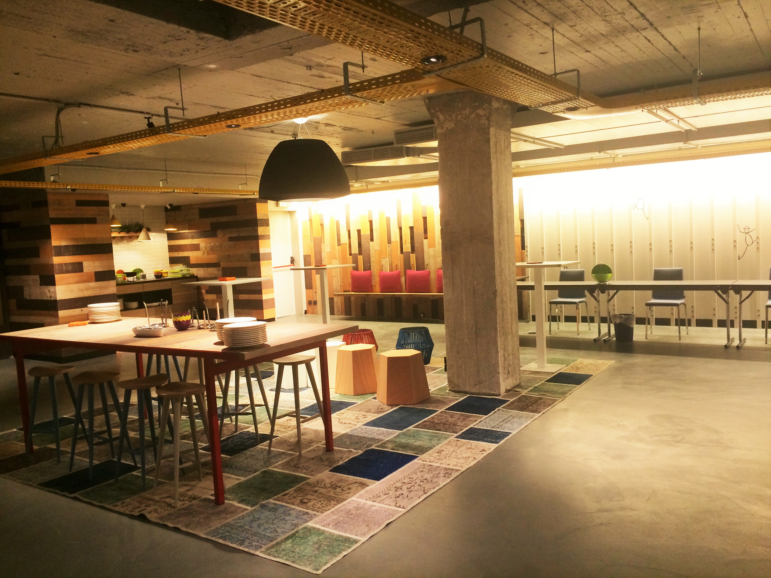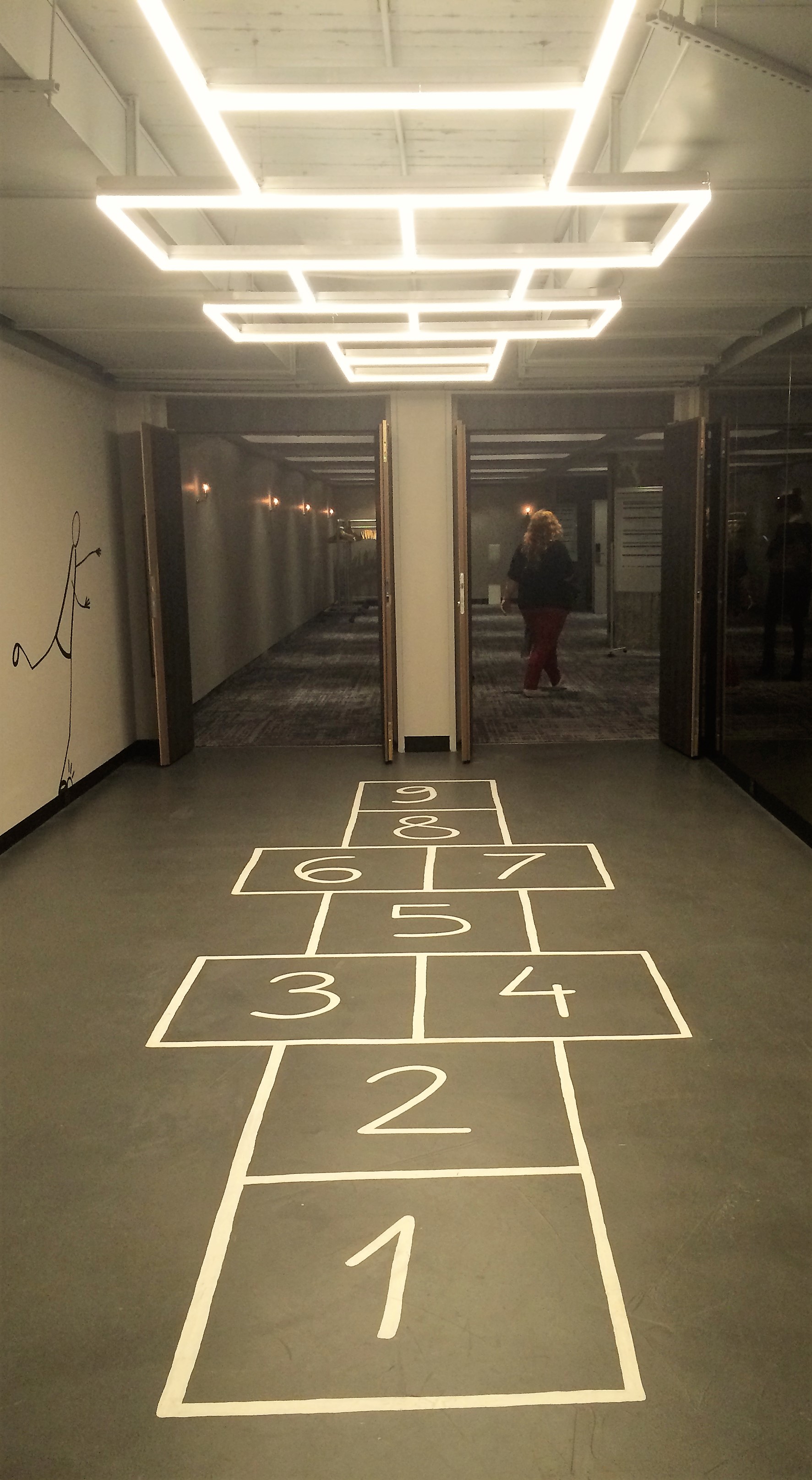 Nog onder de indruk van de kamers valt onze mond open in de kelder. “Tijdens de week onthalen we vooral business mensen, maar zaken hoeven toch niet saai te zijn???” Inderdaad, de lunchruimte verwelkomt ons met frisse kleuren, gezellige zitjes én speelse elementen. Wat dacht je van een partijtje pingpong of een hinkel-competitie?