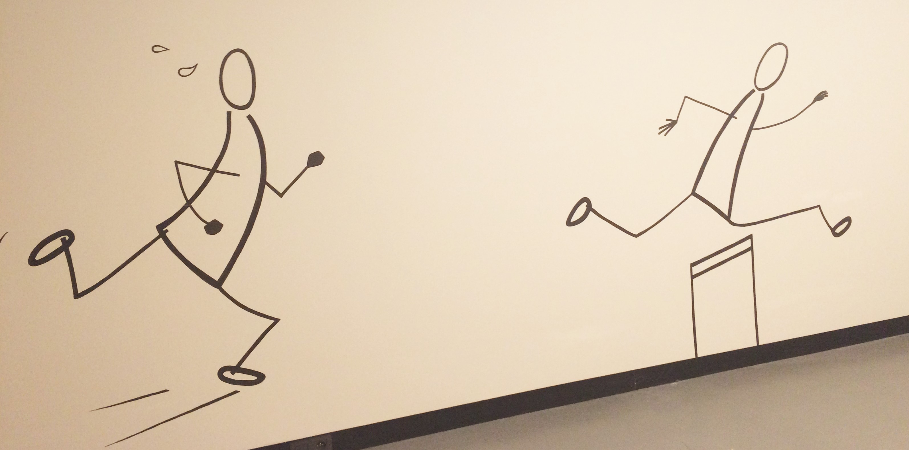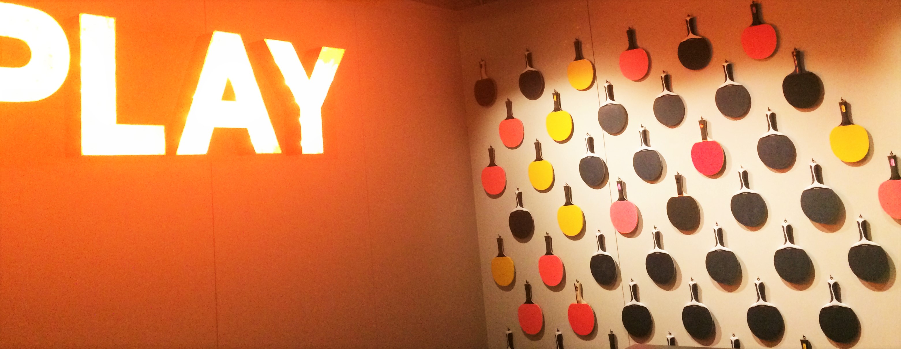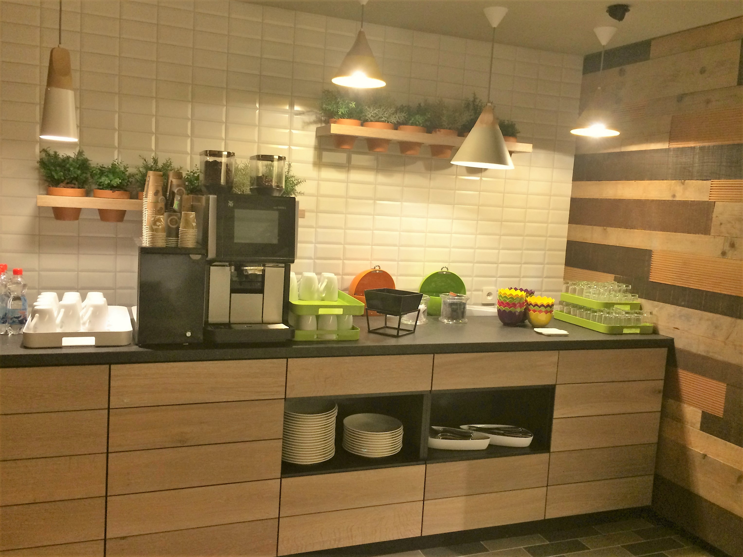 Nog onder de indruk van de kamers valt onze mond open in de kelder. “Tijdens de week onthalen we vooral business mensen, maar zaken hoeven toch niet saai te zijn???” Inderdaad, de lunchruimte verwelkomt ons met frisse kleuren, gezellige zitjes én speelse elementen. Wat dacht je van een partijtje pingpong of een hinkel-competitie?