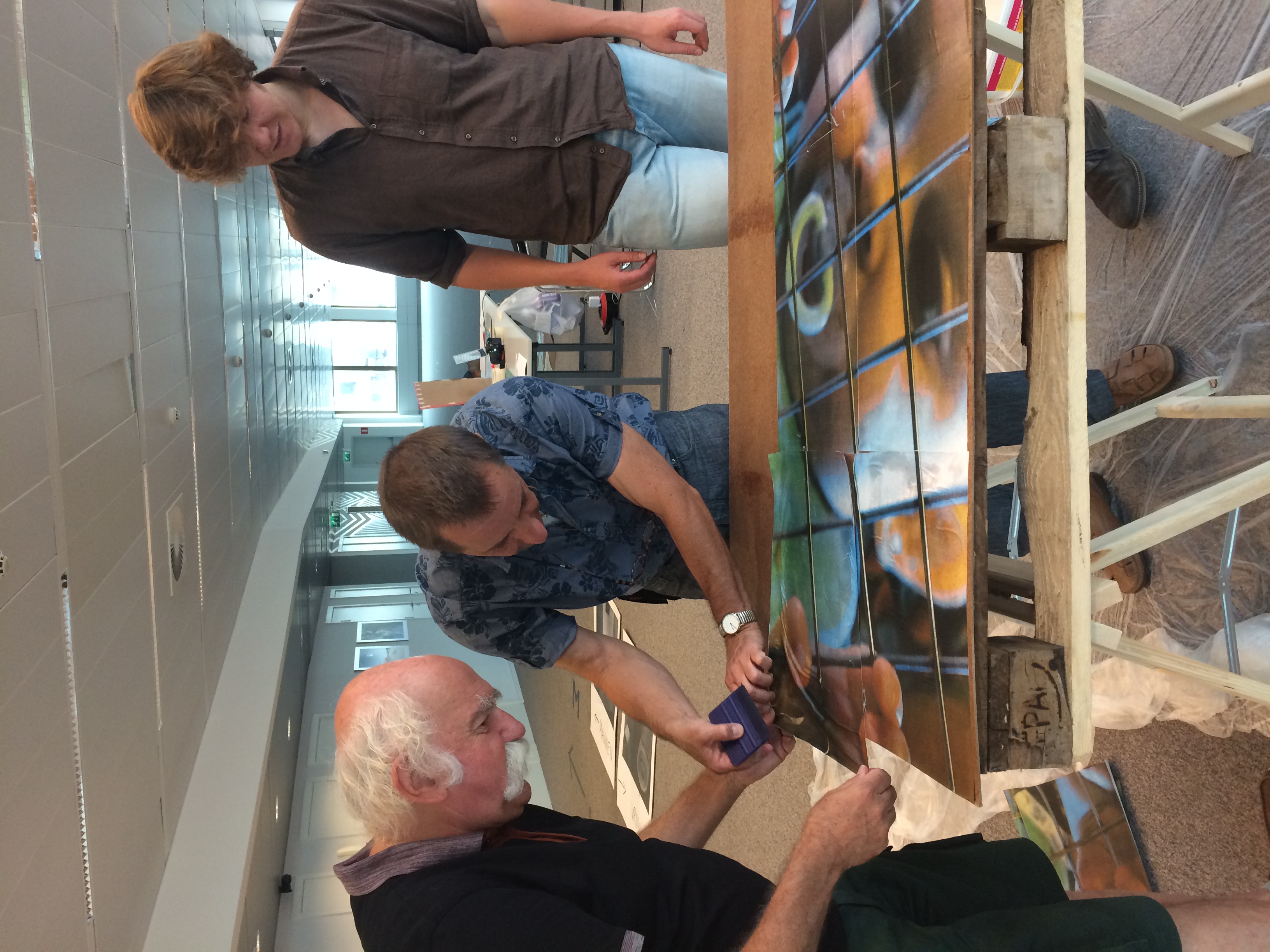 Een aantal artistieke duo’s van alle leeftijden, taal en kleuren knipt, snijdt en plakt intens. OK! De grijs- en wittinten van mijn foto vind ik ‘ijl’ en precies passen bij het thema (blow up). Dan ontvang ik van de gastheer mijn negen A3-tjes. Die moeten we terug samenstellen (hellup!!) en dan de hopelijk juist samengestelde puzzelstukken met behangpap kleven op een stuk karton. Slik! De witte kantjes van een wit/grijze foto snijden??? Dat kan mijn secure man… En dan staan we allebei zonder bril ons intensief te amuseren… Het kleven en kliederen mag je altijd aan mij overlaten… Yes, I can!