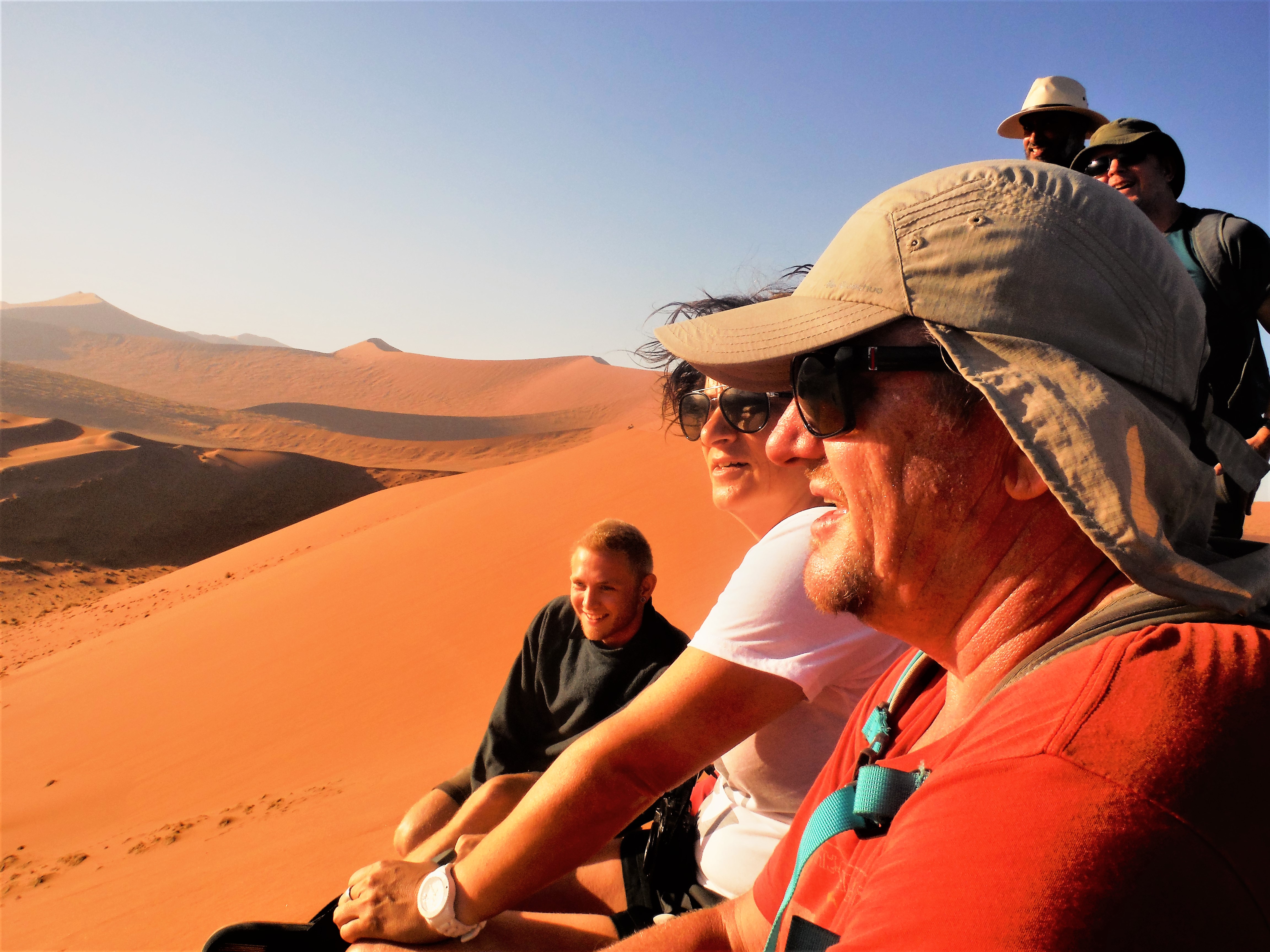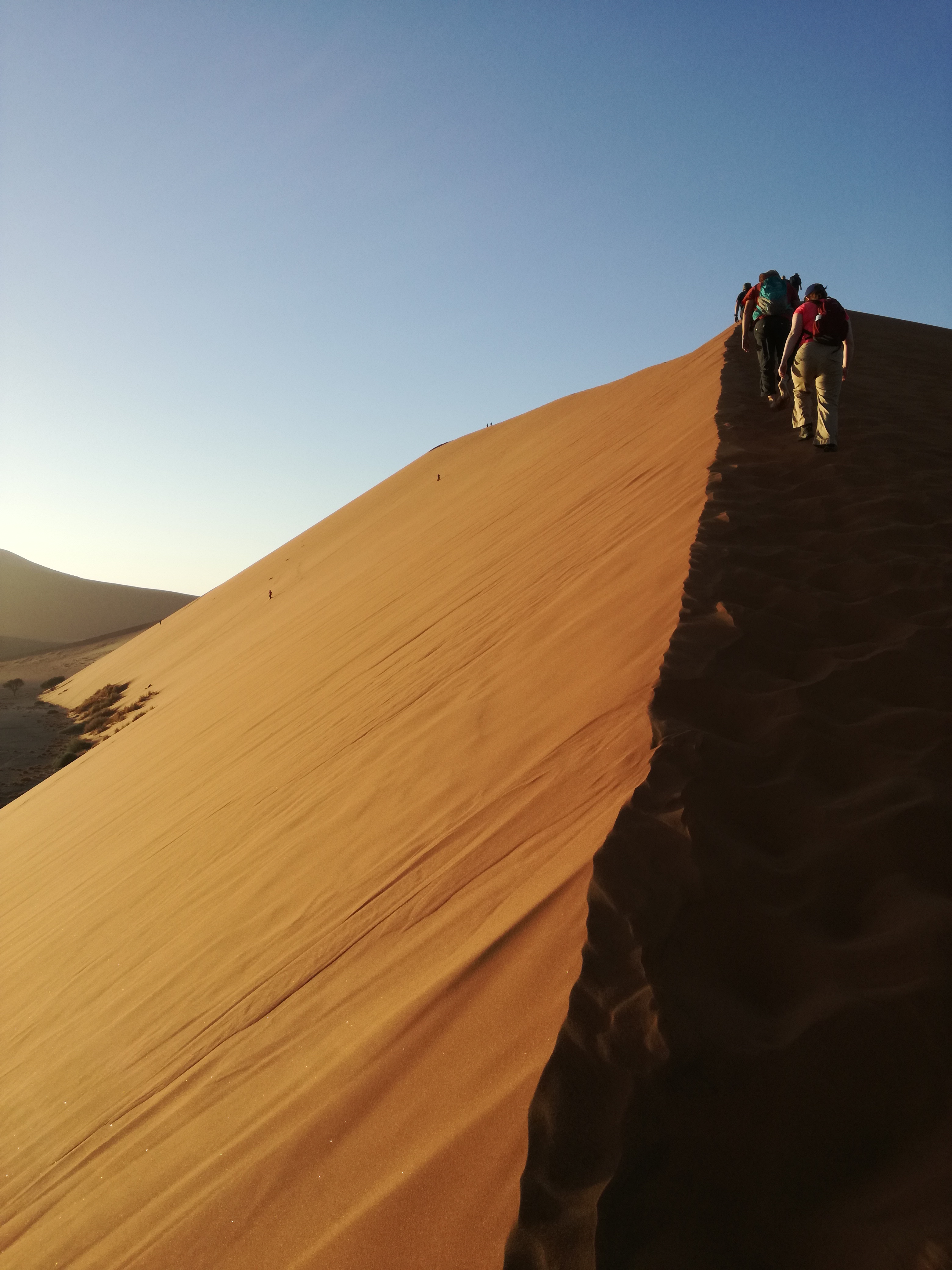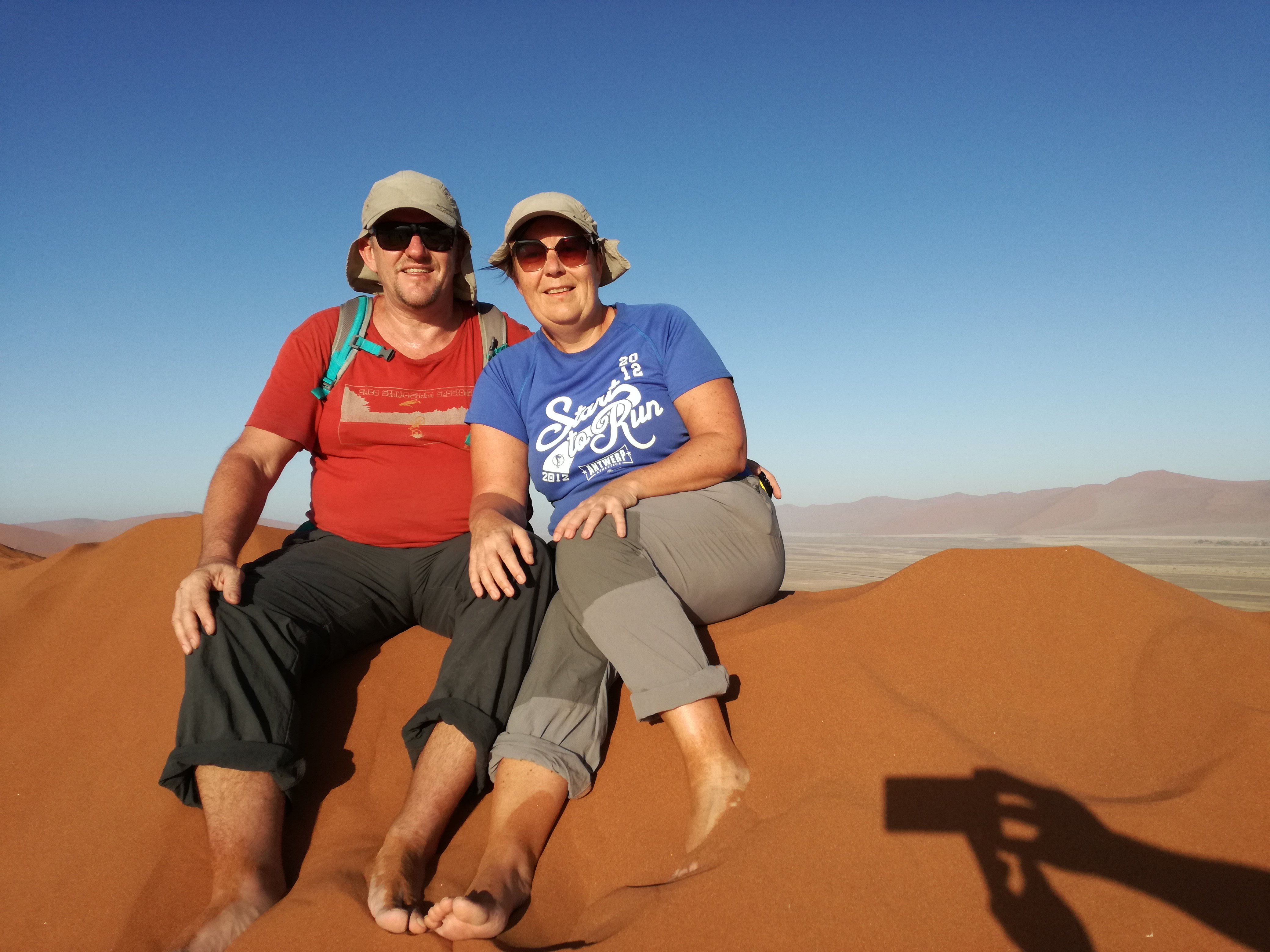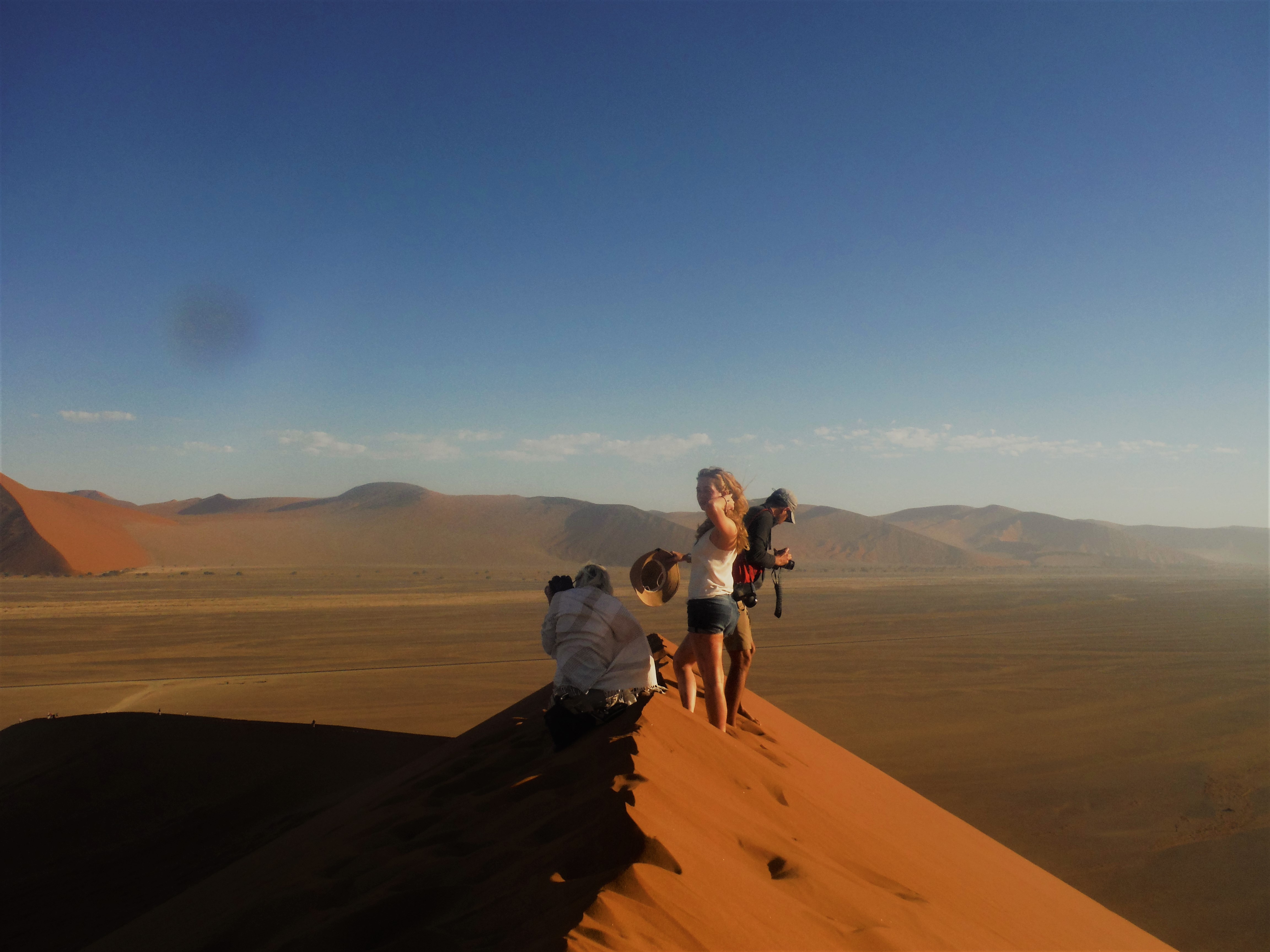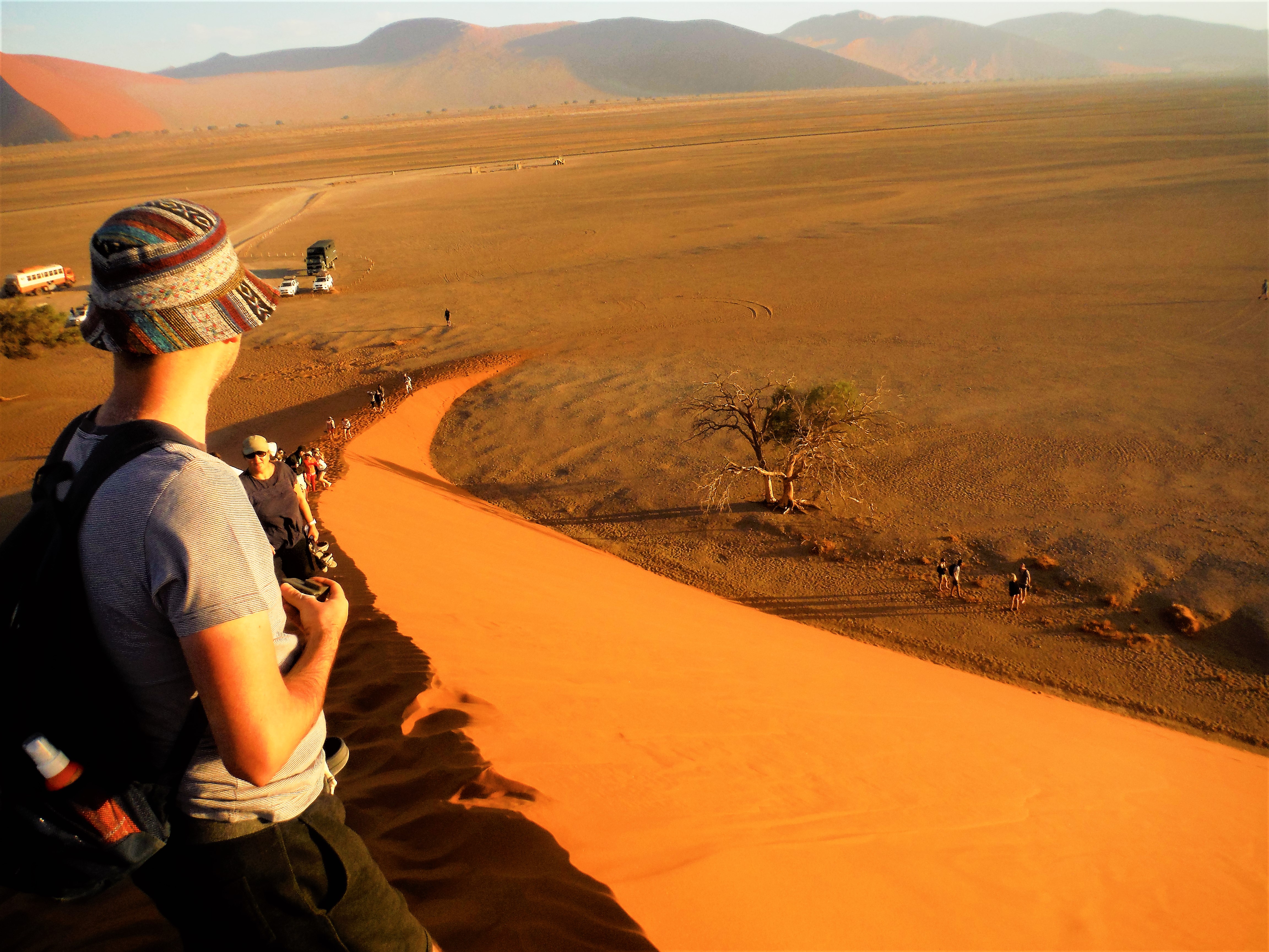De beklimming doe je best op blote voeten (huh?), want het zand voelt dan nog koel aan en je zakt ook telkens diep weg. Dankzij mijn hardnekkige verkoudheid (jawel!) beneemt de rooie duin mijn adem. De 200 meter hoogte vormt niet de moeilijkheid, wel het griezelig dunne randje waar je op stapt én de hitte. En we hebben geluk… véél geluk. Geen andere toeristen te bespeuren en het is maar 35°C…. De dag voordien hijgden andere toeristen onder de felle zon in zo’n 47°C. #sjanske