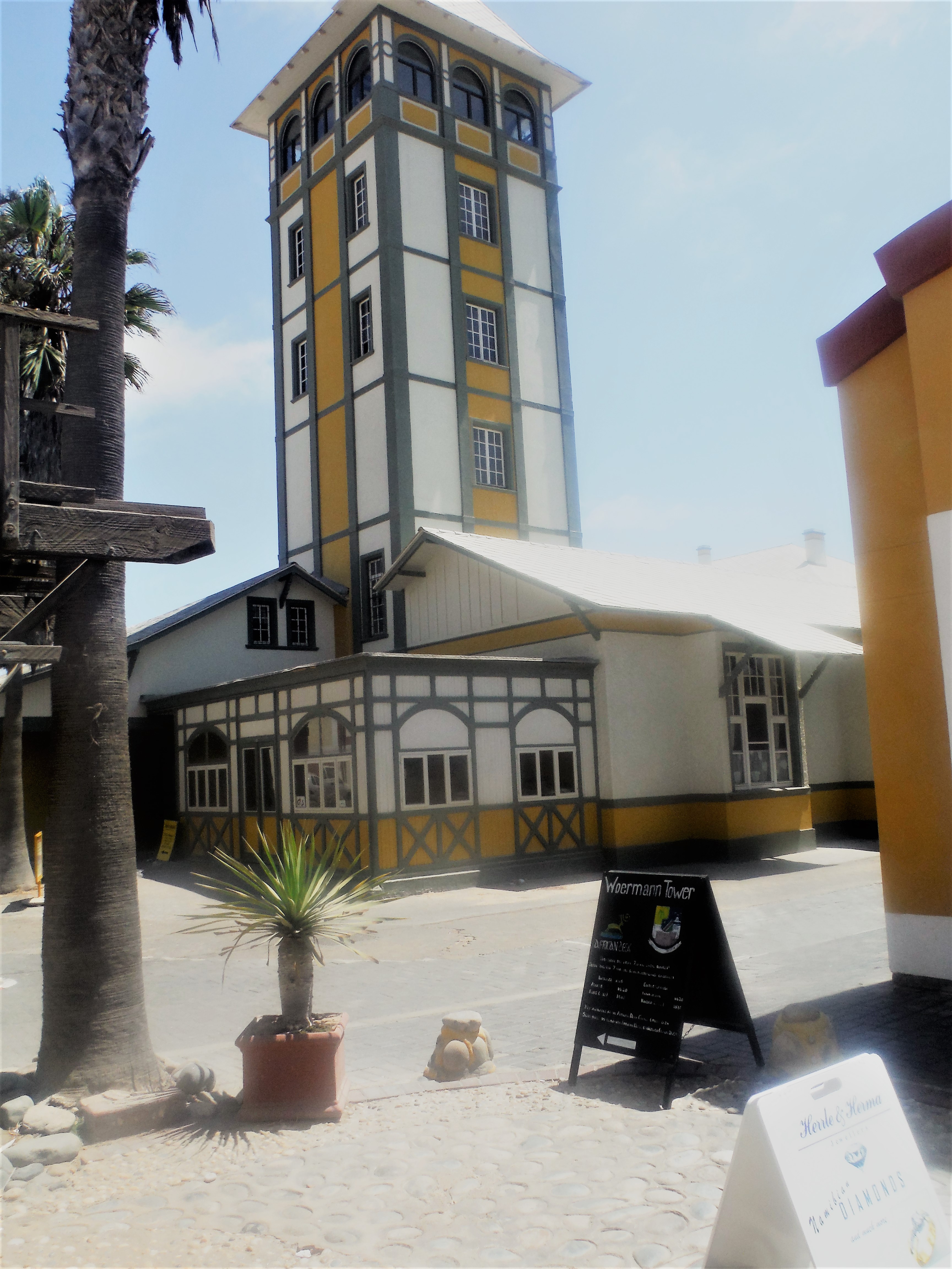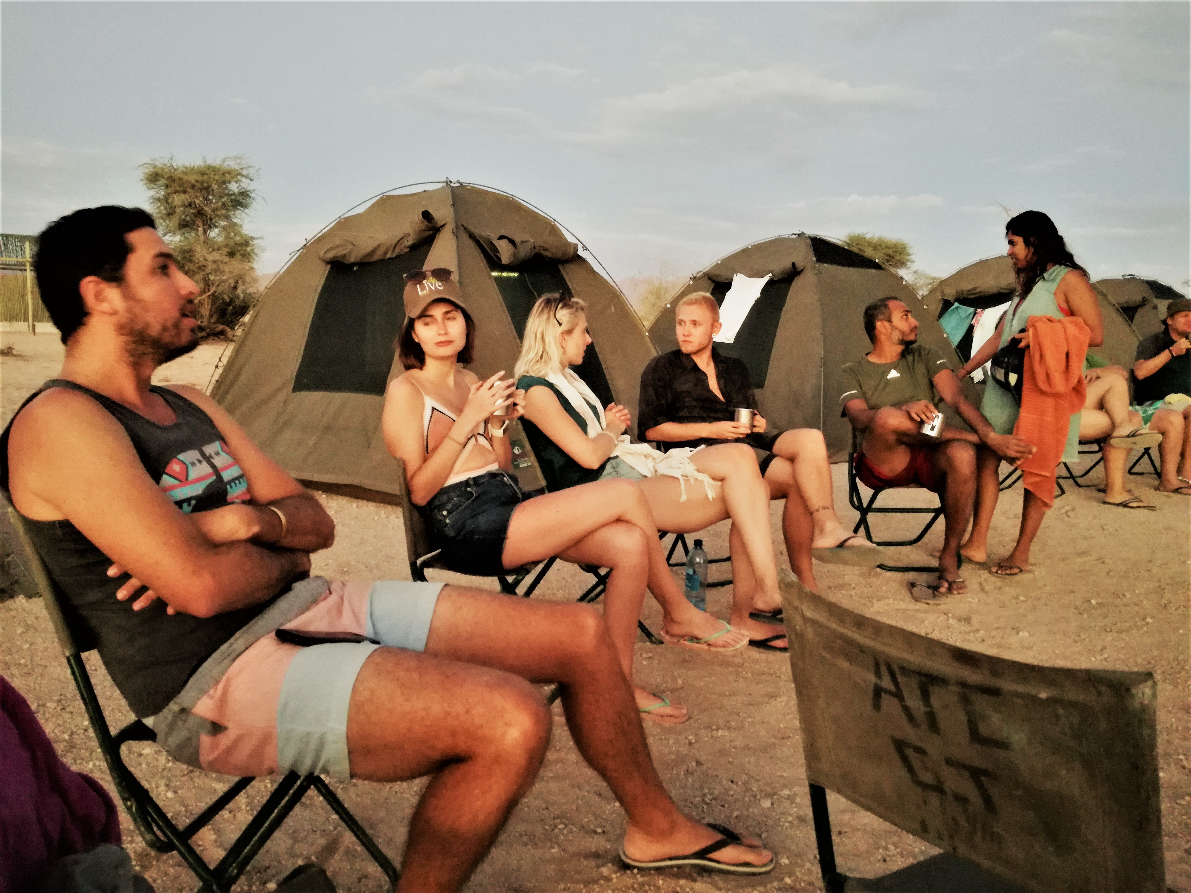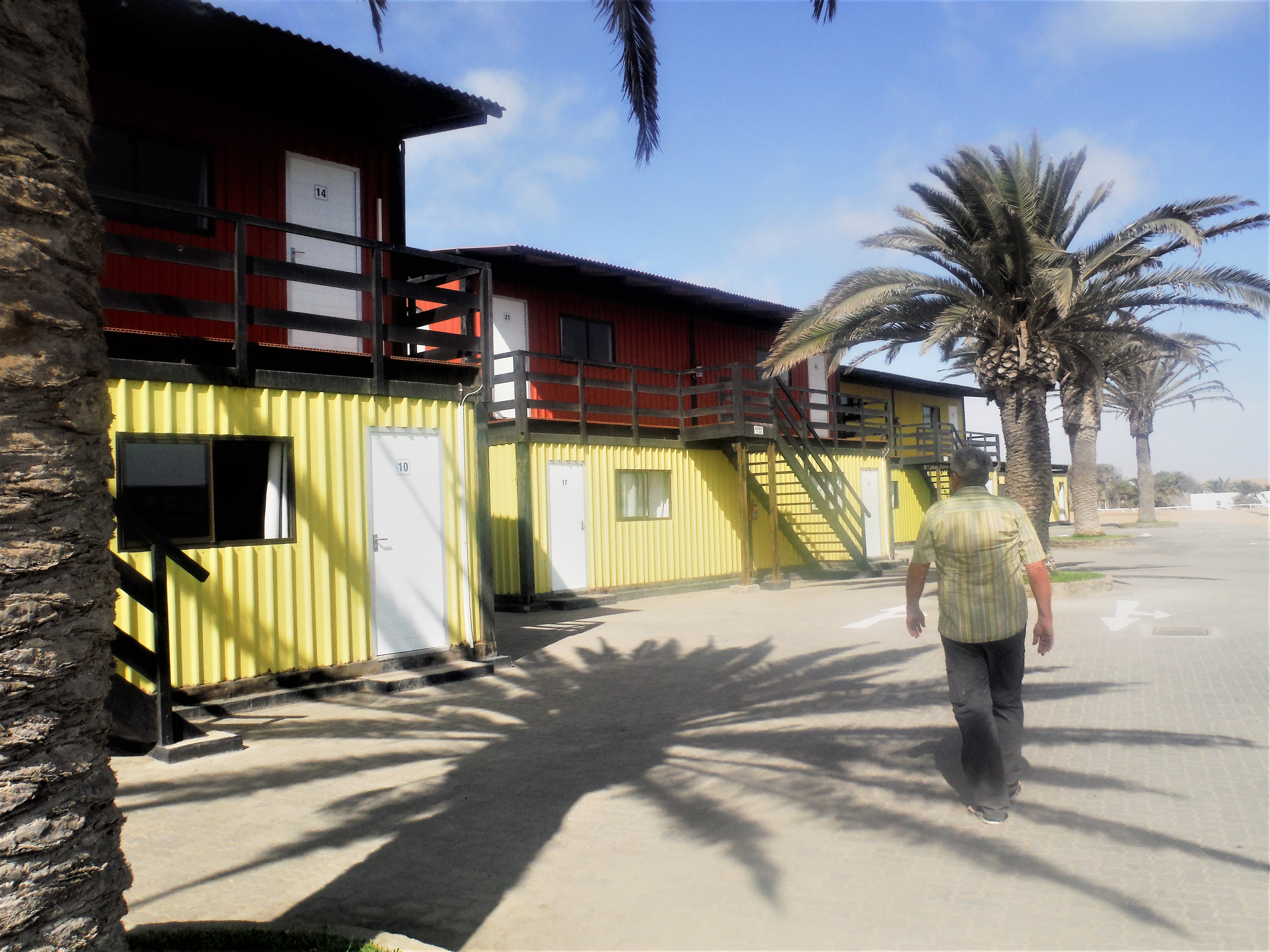 In Swakopmund logeren we in een containerhotel en duiken het stadje in om Bratwurst te eten :-). ’s Avonds genieten we van een heftig feestje in de leuke bar Napolitana, waar de eigenaar mijn flipflop repareert…