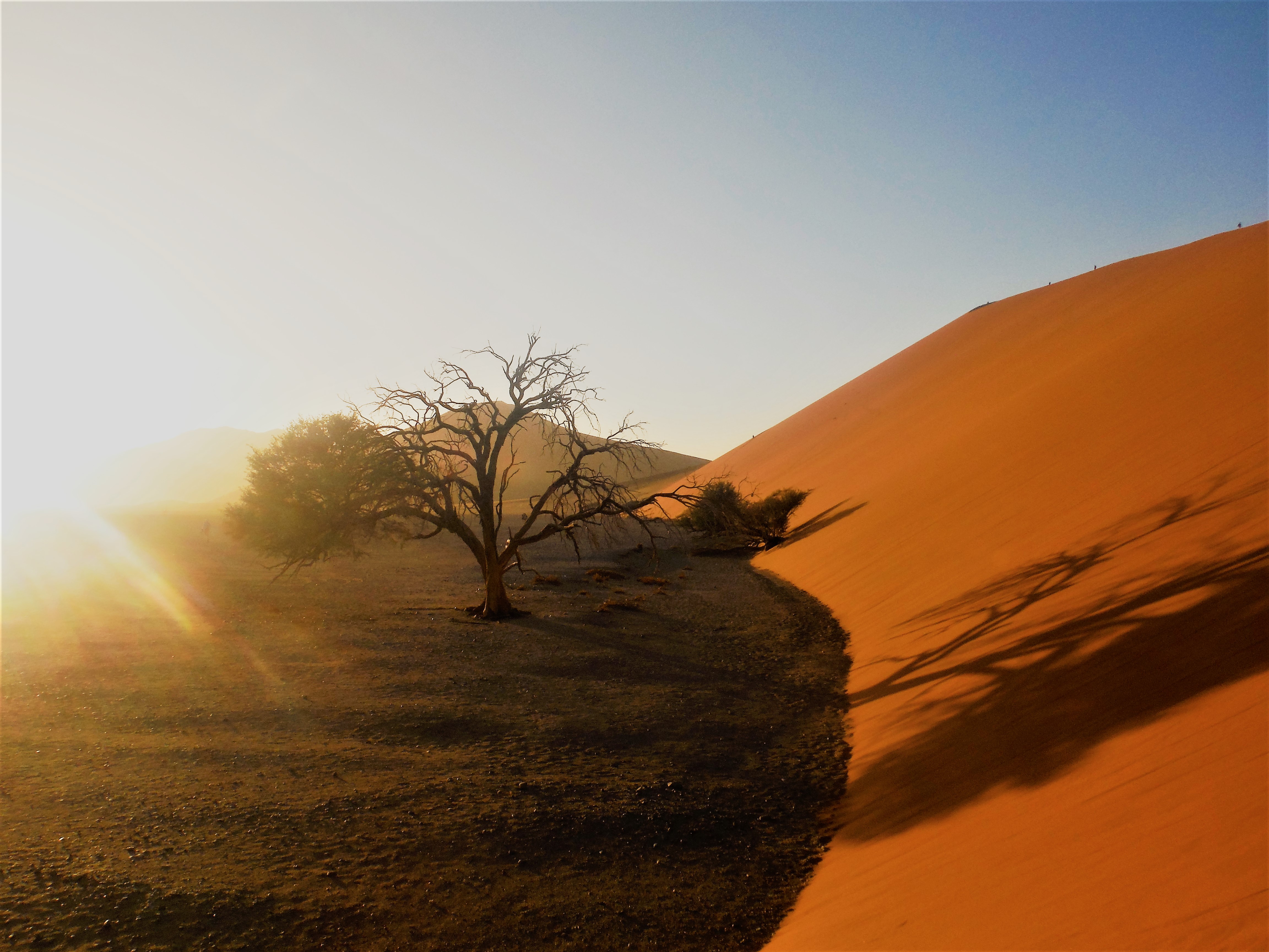 Na de zonsopkomst op de statige rode duinen brengen we een bezoek aan de deadvlei. Een nogal kleine vlakte (ik had me deze veel uitgestrekter voorgesteld) met zwarte, dode bomen van 900 jaar oud. Niet versteend, wel helemaal verdroogd. Merkwaardig!
