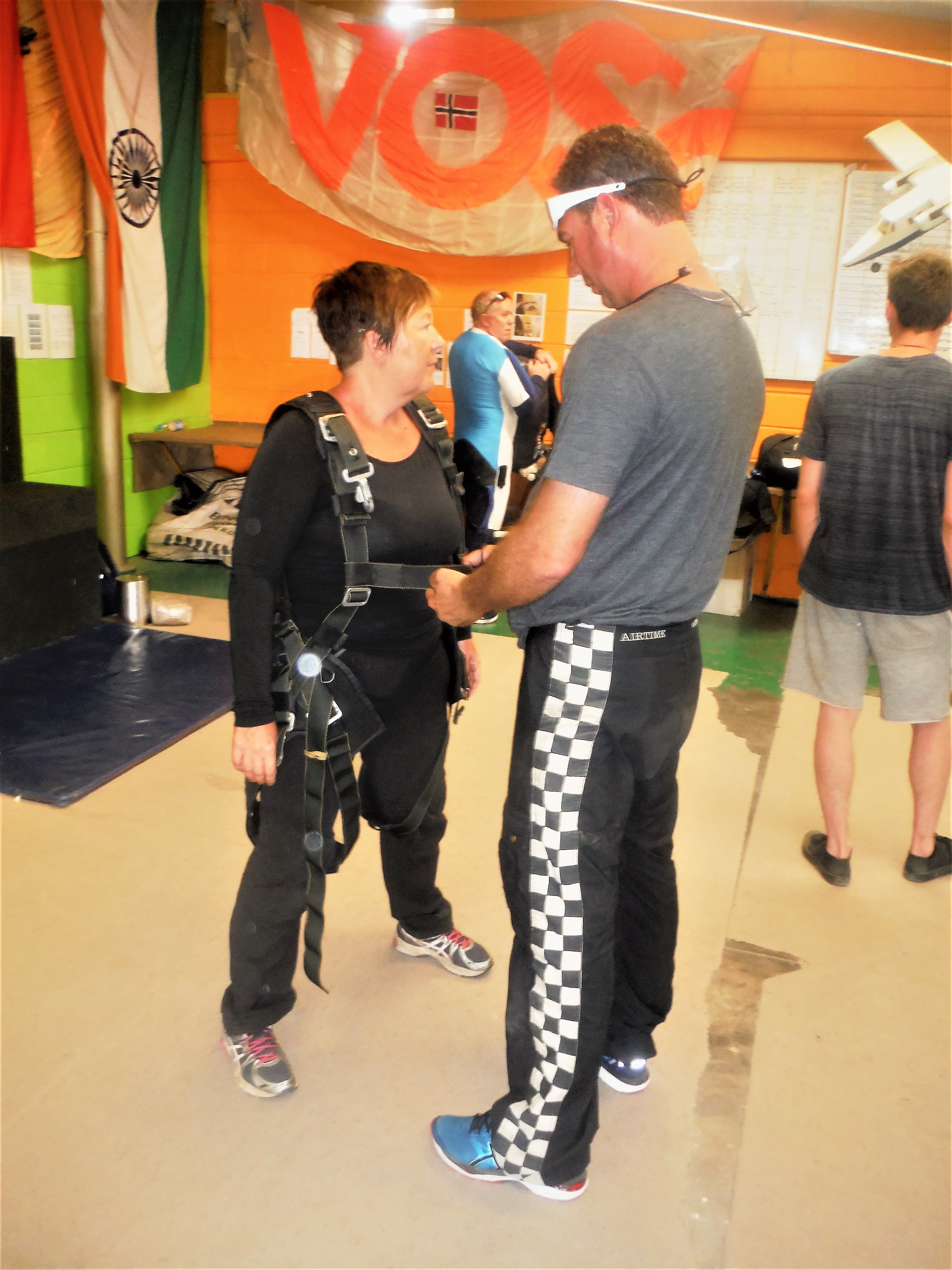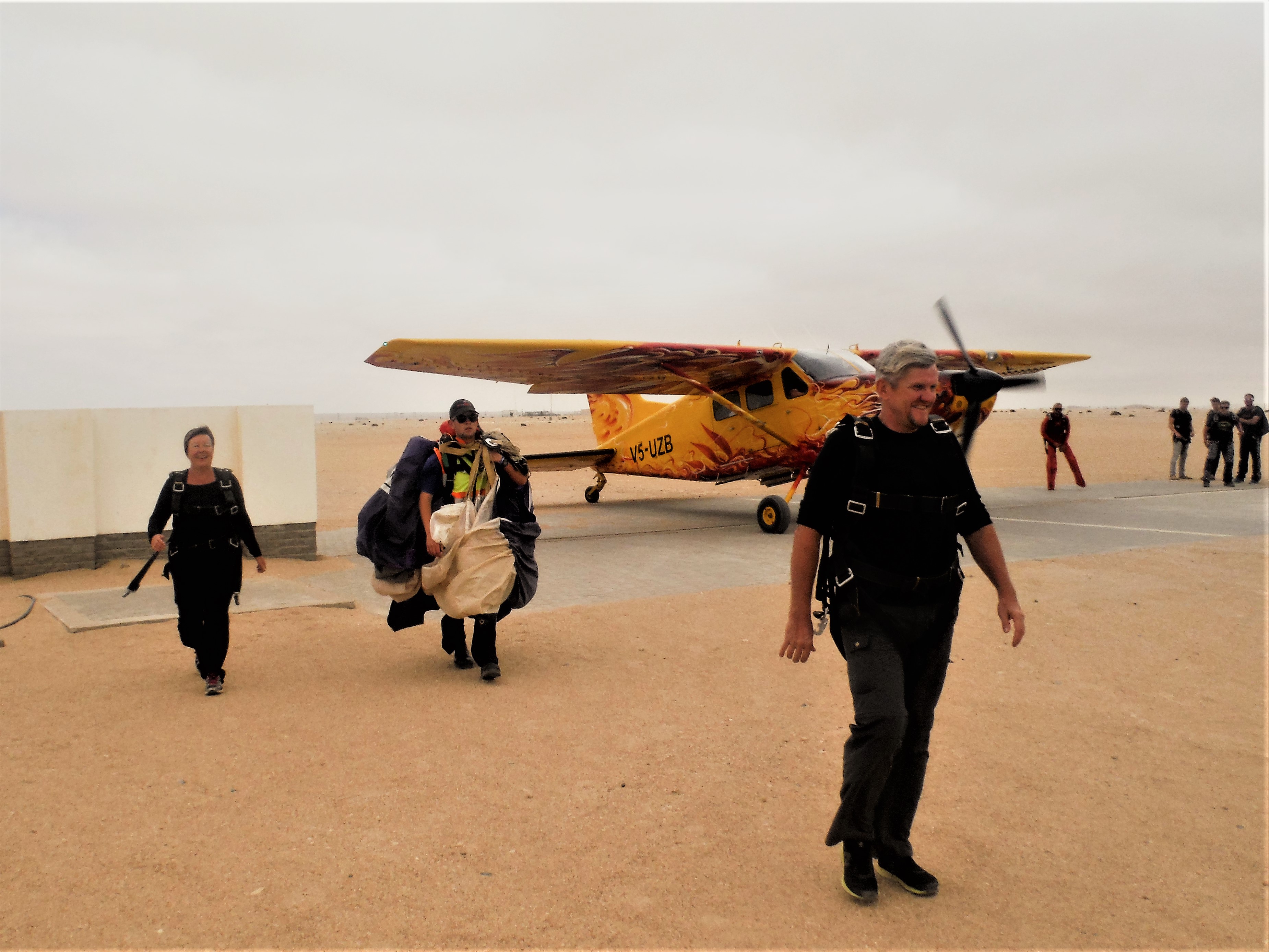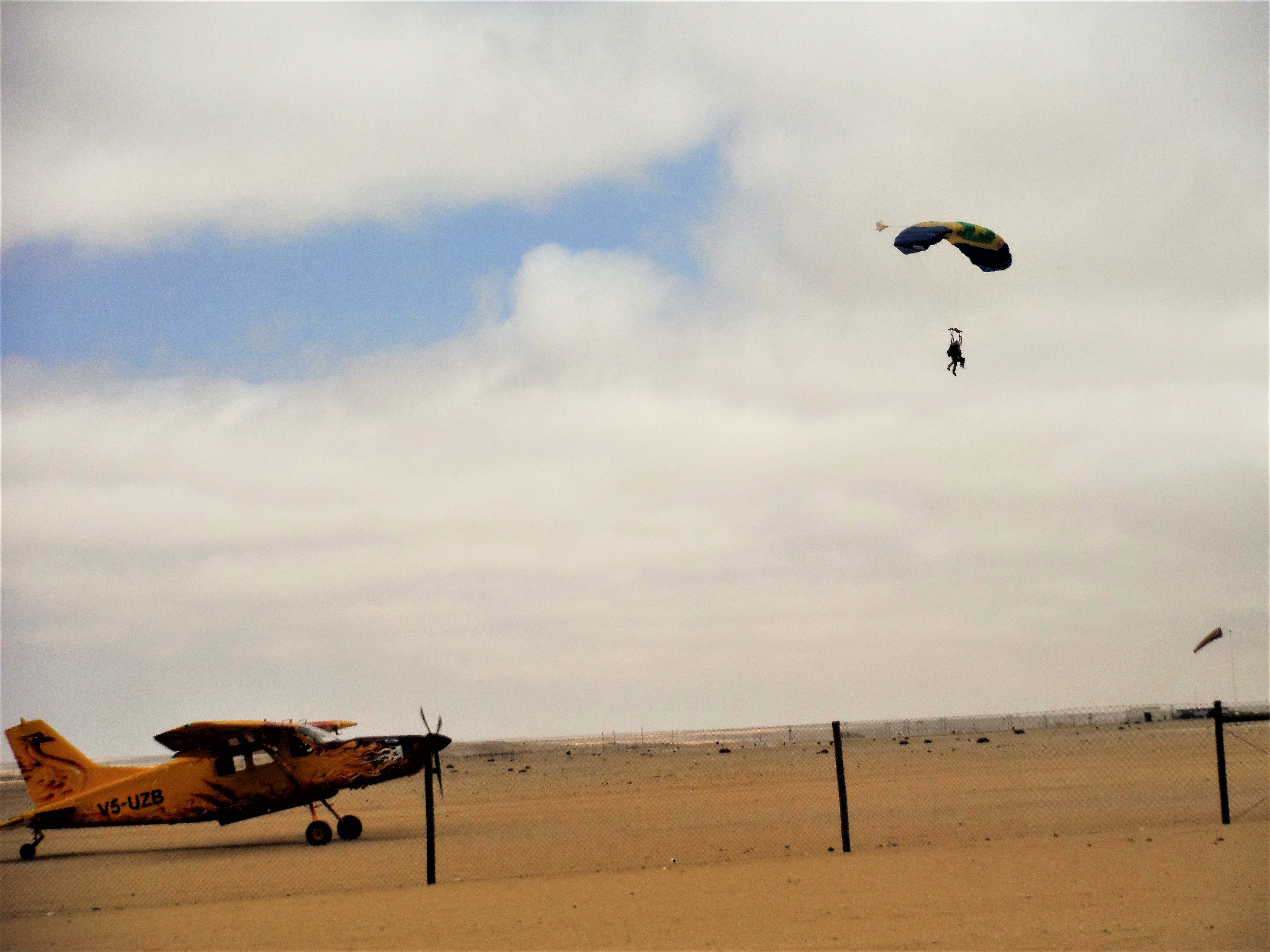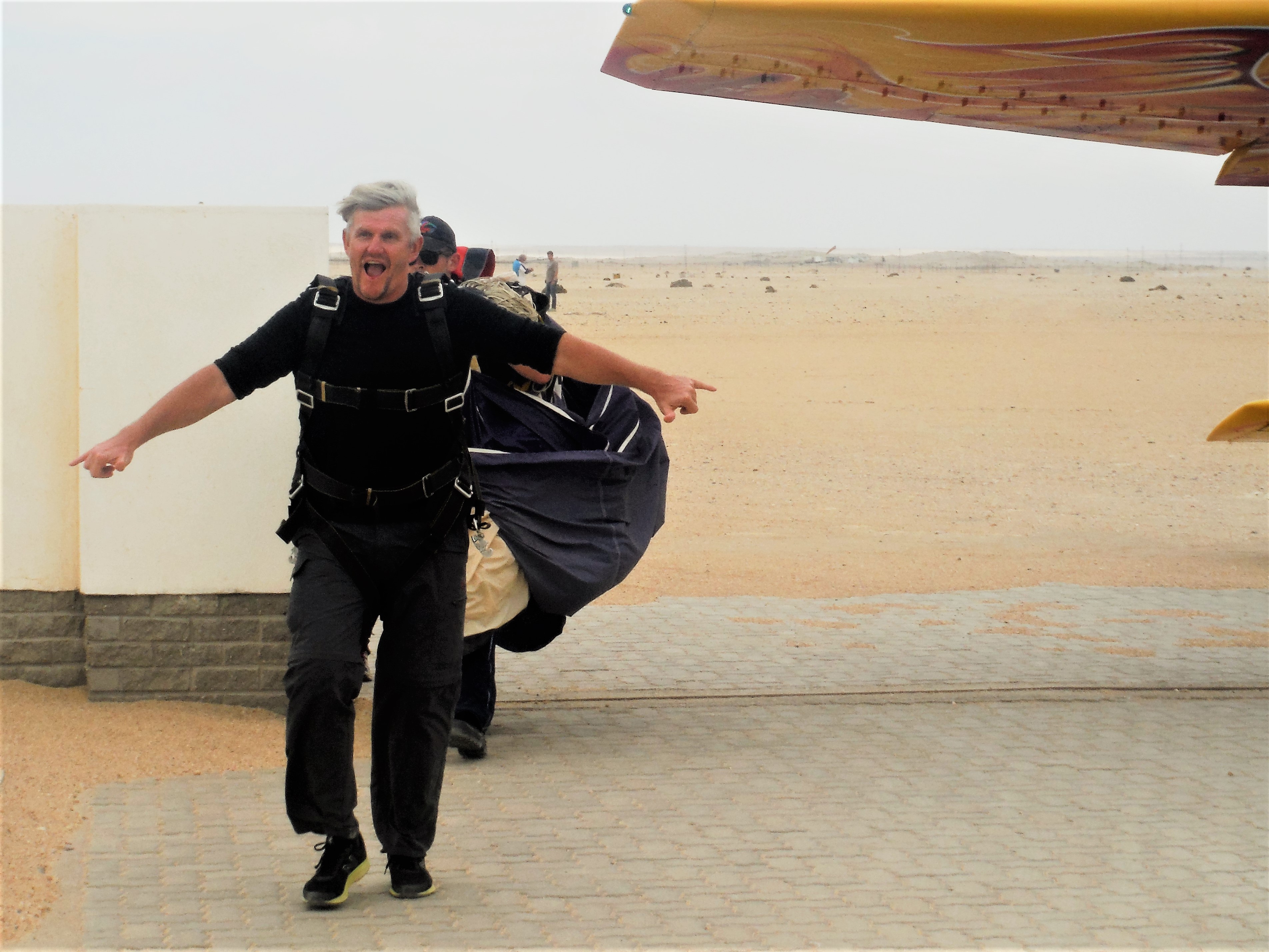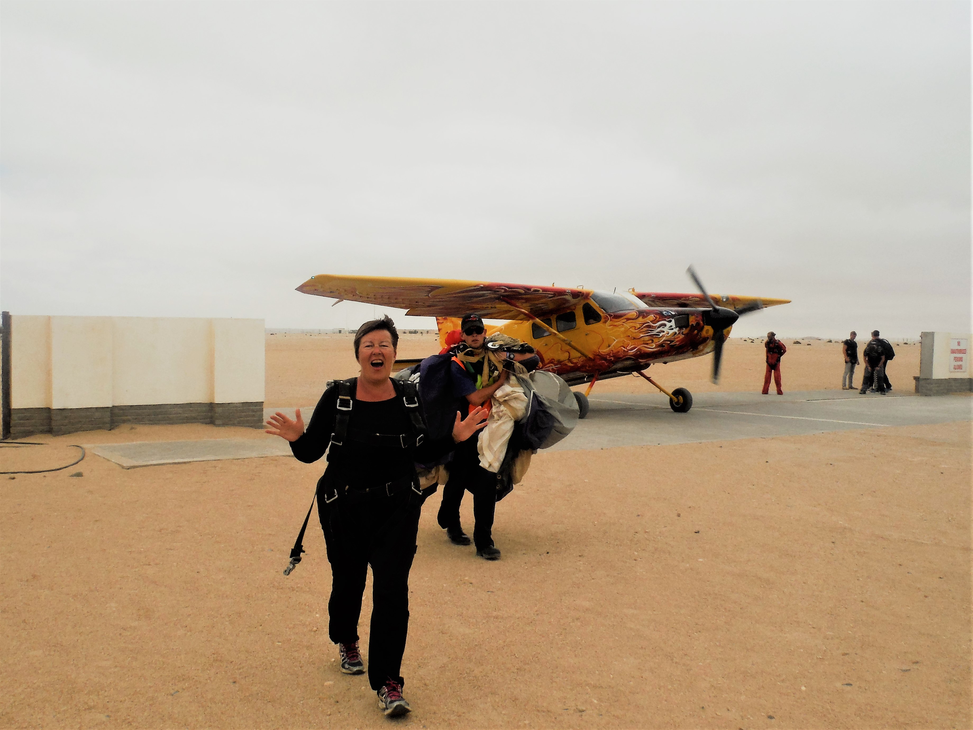 En dan kiezen we het luchtruim. In plaats van te gaan ‘sandboarden’ (je moet telkens terug naar boven klimmen… vermoeiend!), willen we een memorabele ervaring: skydiven.