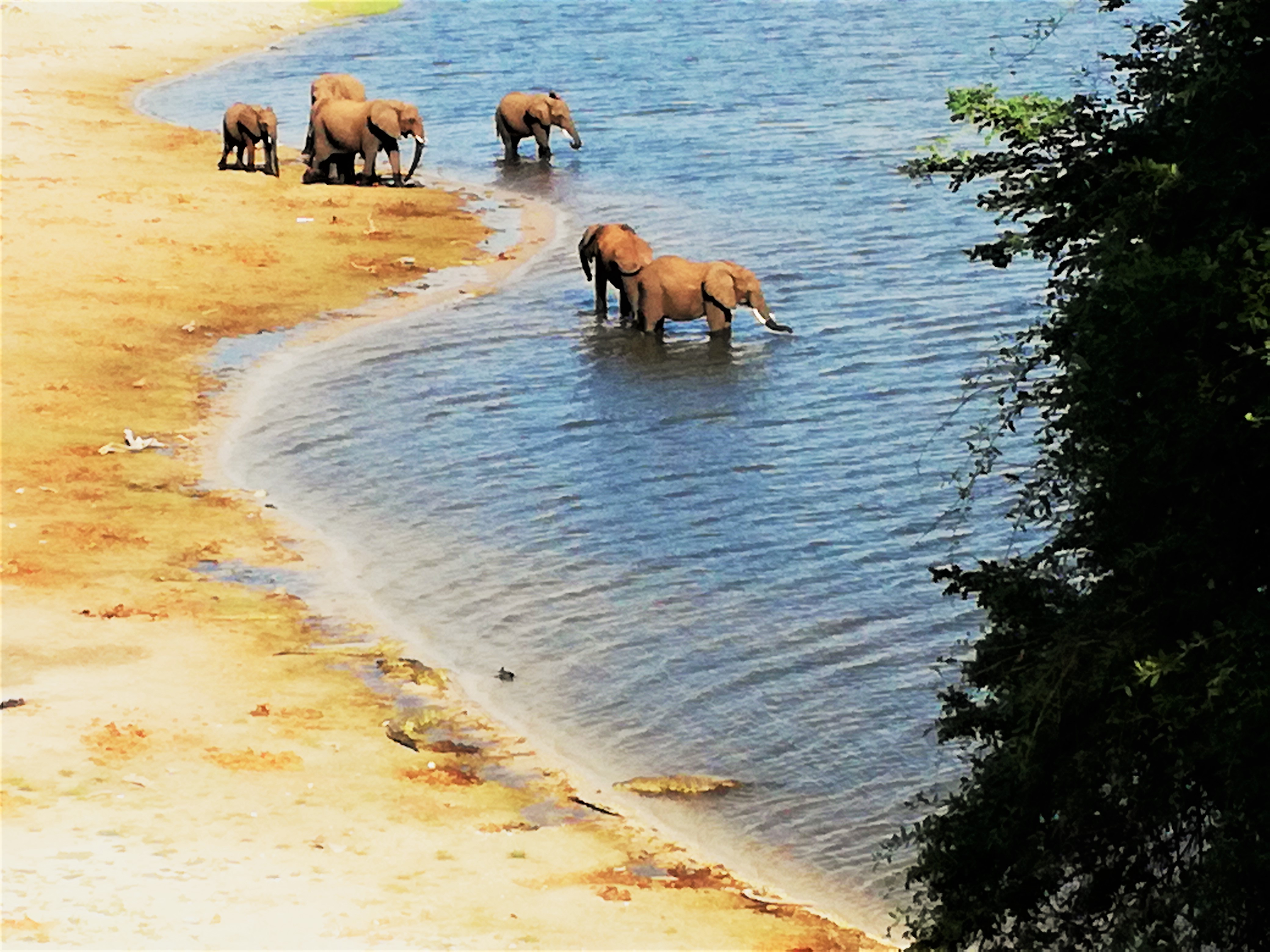 Dirk en ik zitten op ons ‘paalterras’ te genieten van een wijntje als plots op ooghoogte een olifant aan de zijkant verschijnt. Dirk schrikt, stoot zijn glas om en de olifant schrikt ook en loopt versneld achteruit… Zoooo komisch.