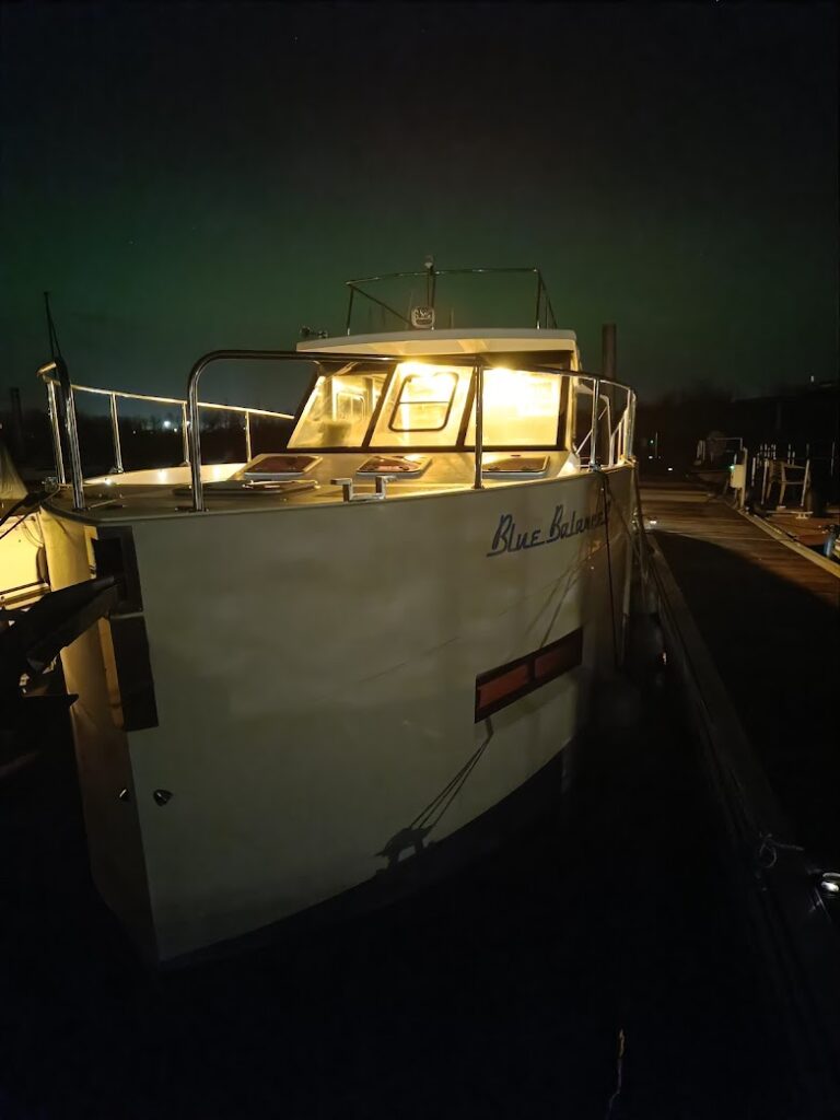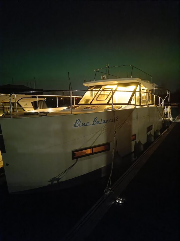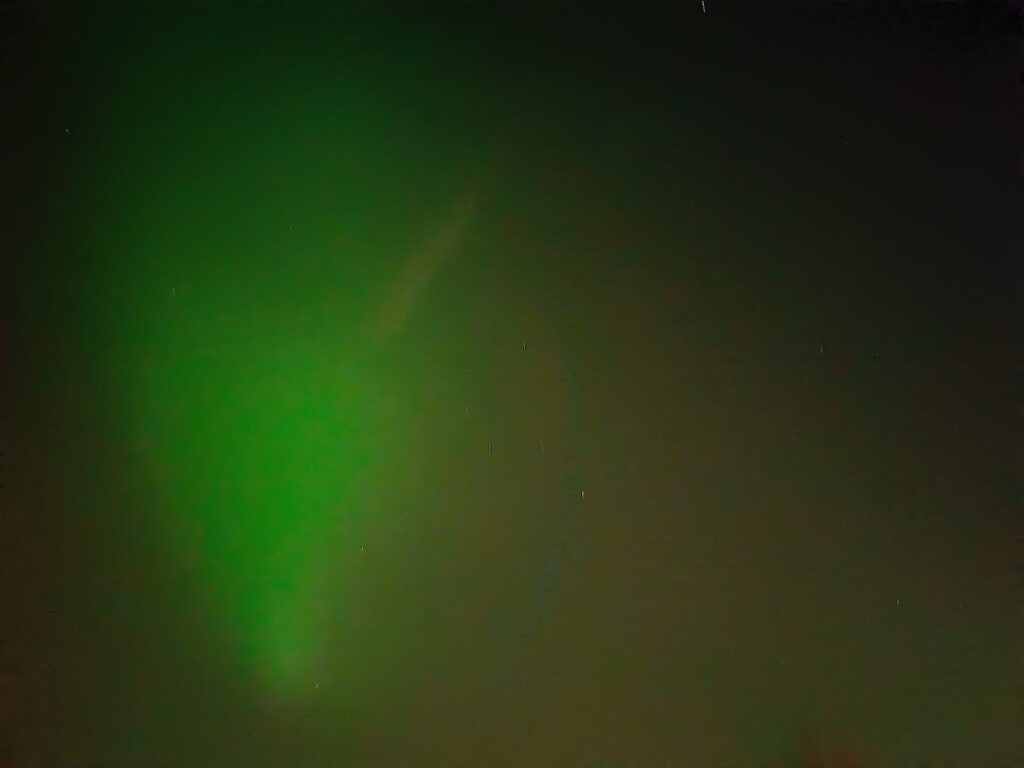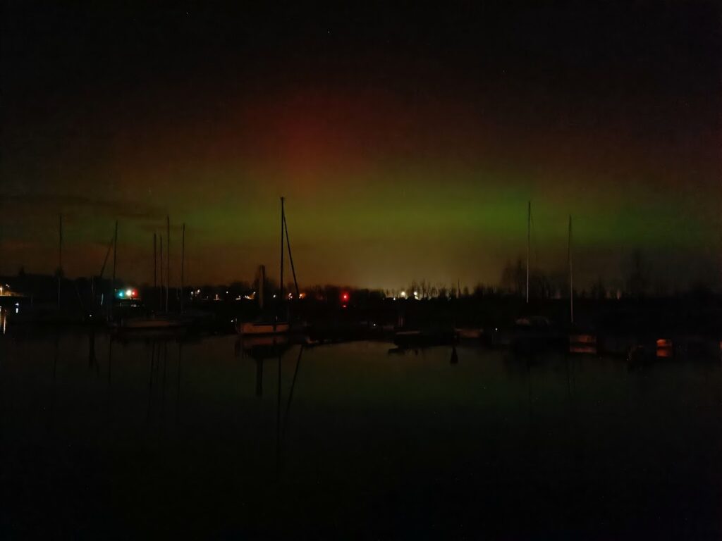 We spreken af met Luc en Chris om te smullen bij Spaenjerd, waar we onze eerste nacht hebben geslapen. Alweer honderduit babbelen 😁. Als we terug naar de boot hinken (met verstuikte voet van Dirk), nemen we een poort te vroeg en verdwalen we op een camping 🙄. Oké, terug dus … Aangekomen aan ons schipje, neem ik nog wat foto’s met de lichtjes en … Hee! Dat geeft zo’n raar groen licht … HET NOORDERLICHT! gil ik naar Dirk. Wat een traktatie 🍀🍀