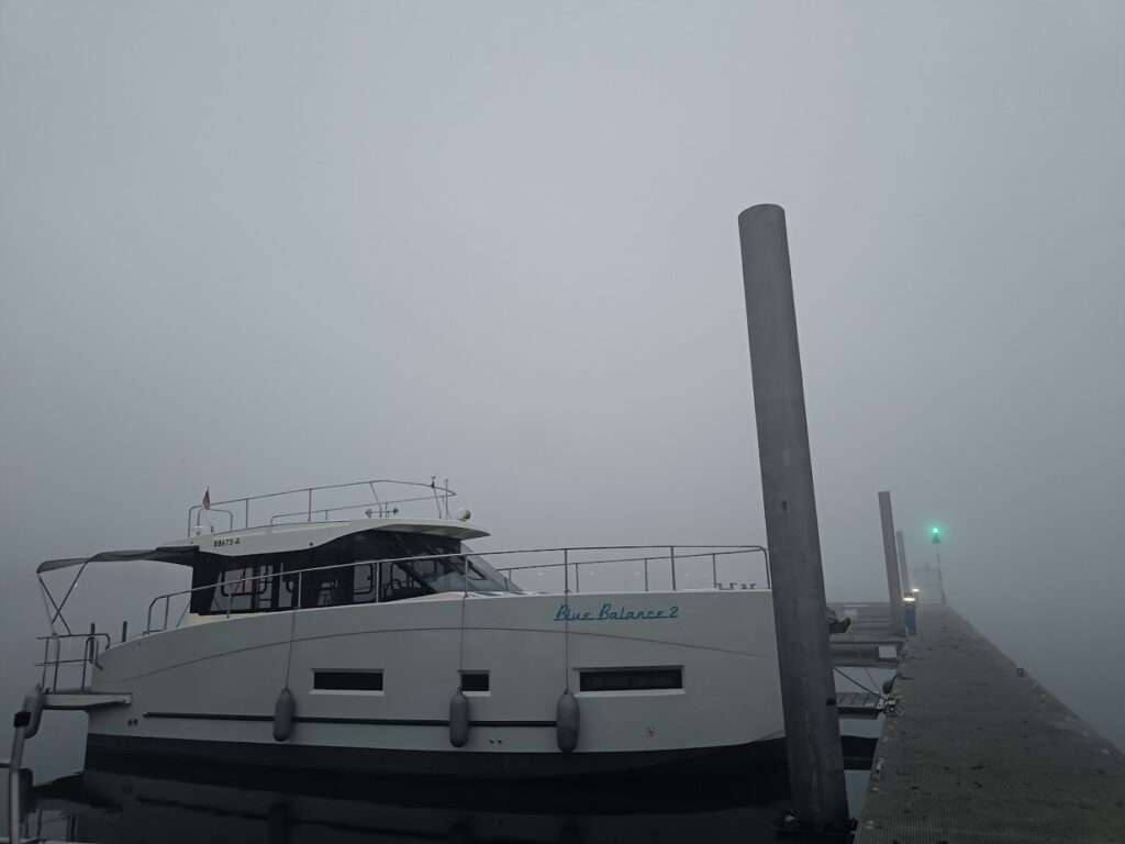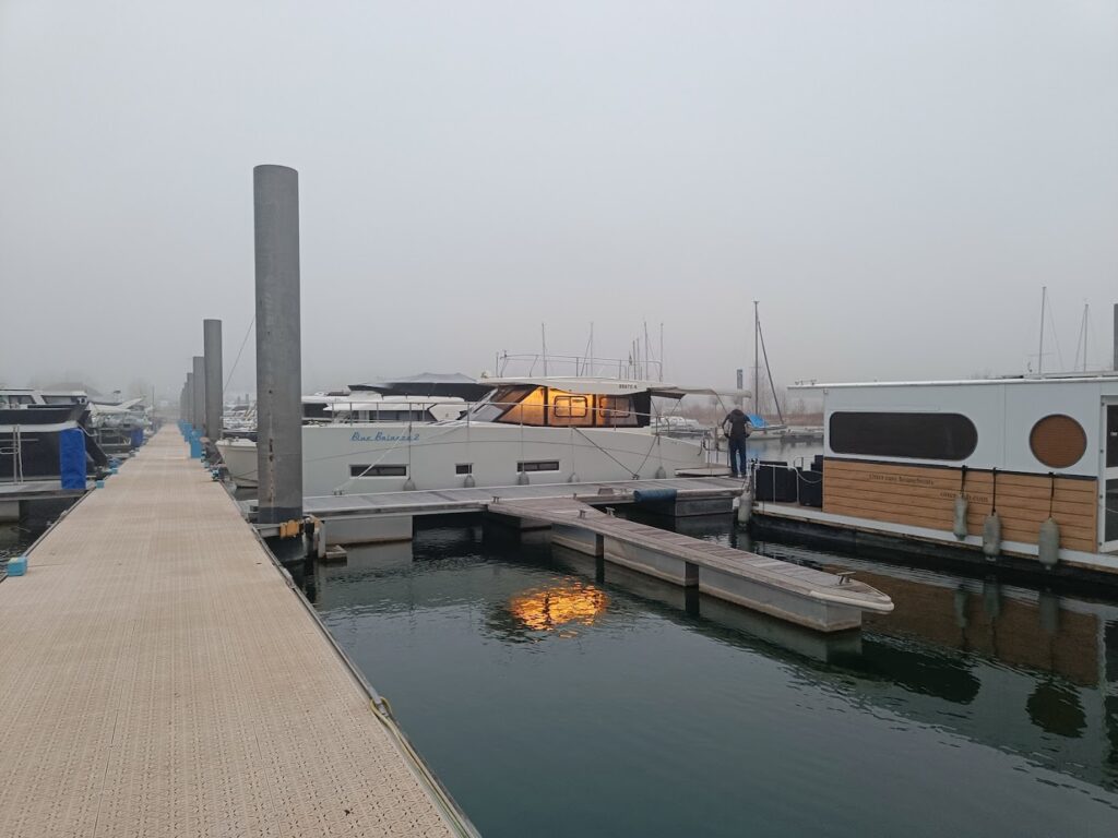 Als we willen aanmeren op plek 24 (korte steiger, dus achterwaarts aanmeren 😬) hangen over onze plek de koorden van de buur, dus dat lukt niet. We mogen nog een betere en ruime plek nemen aan de kant met laaaange steiger. Vind ik leuk! Alleen past onze kabel niet in de ellentriek kast. Naar het Havenhuis dus om een tussenstuk te zoeken…