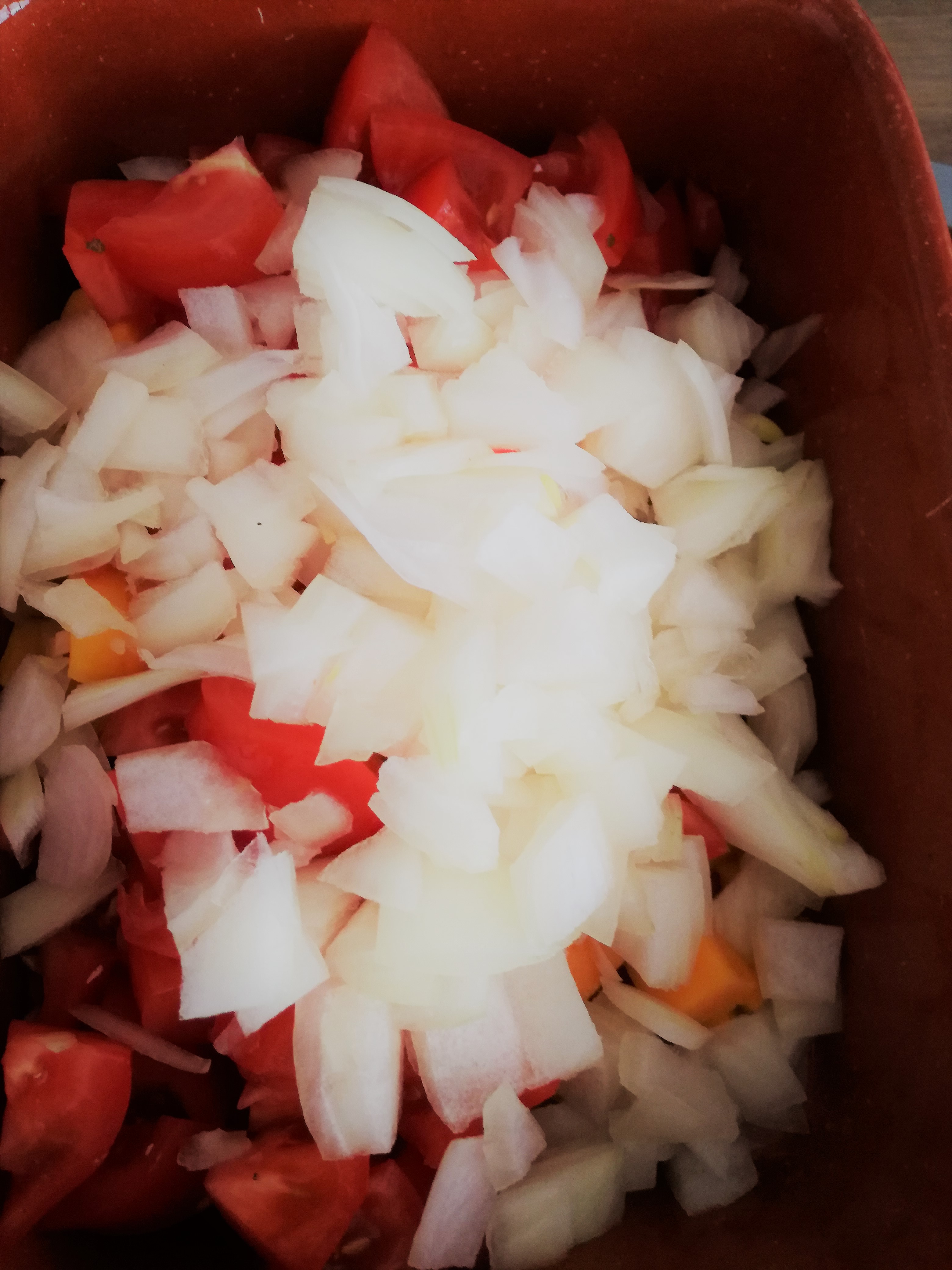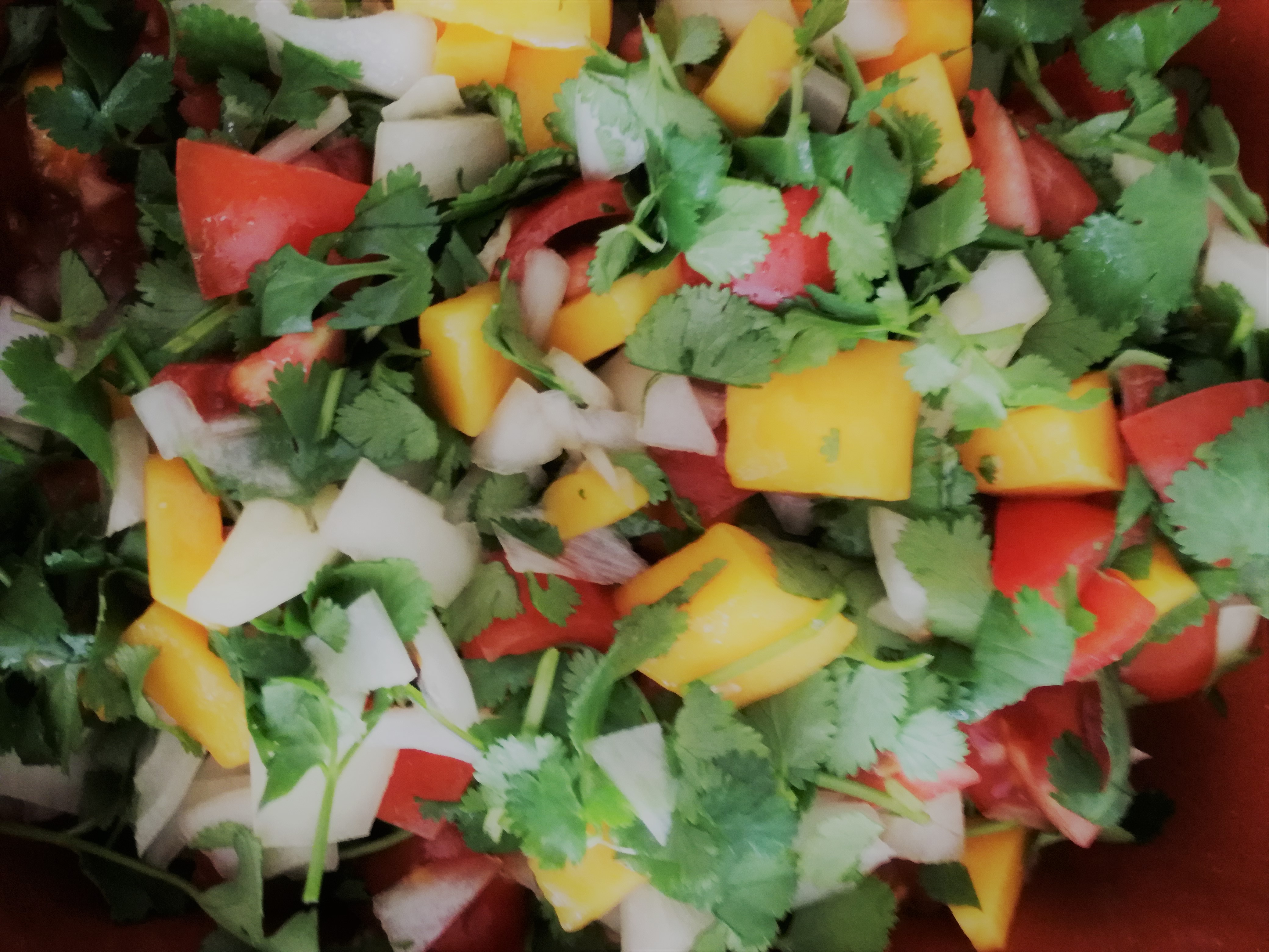 • Snij de mango, ui en tomaten in stukjes en meng in een schaal