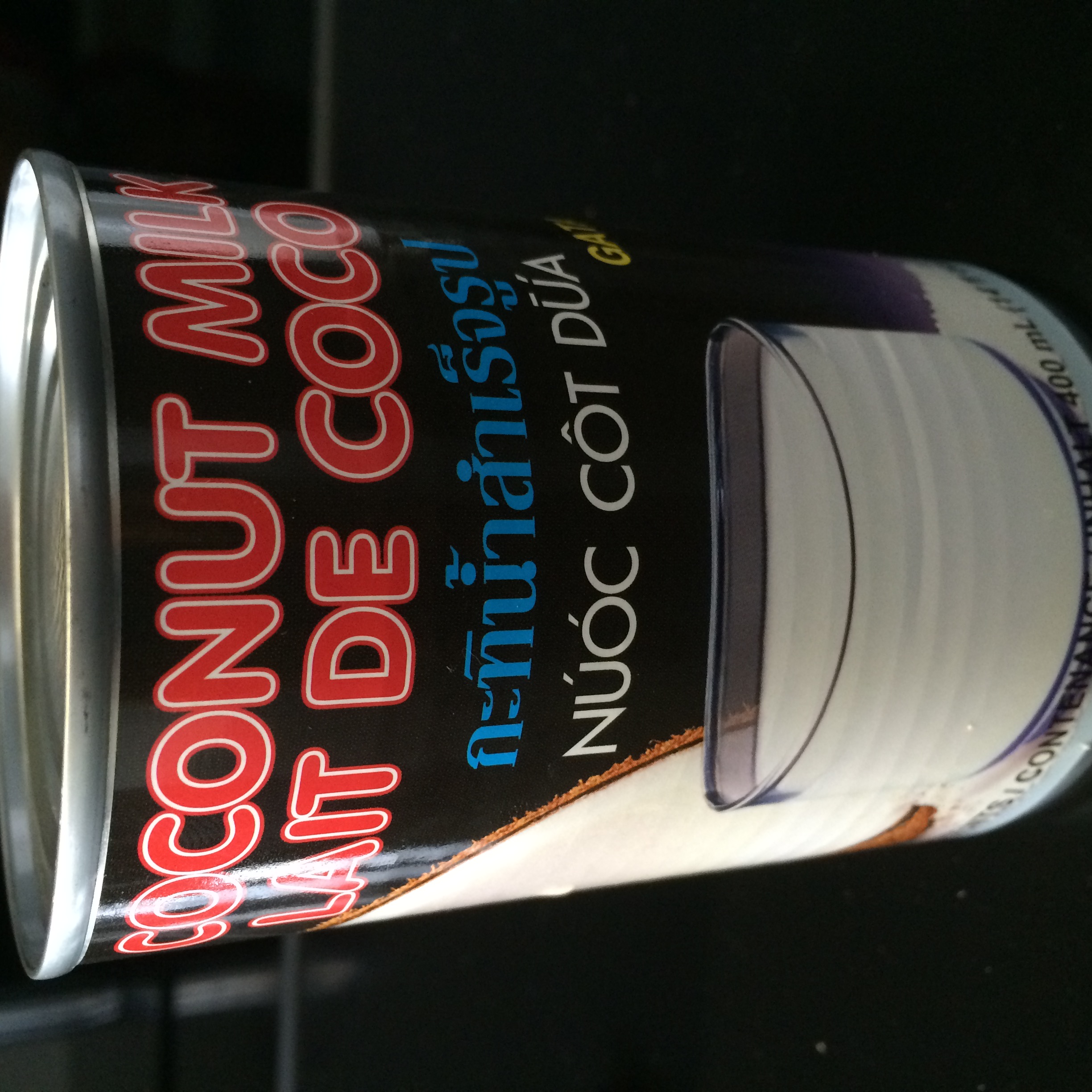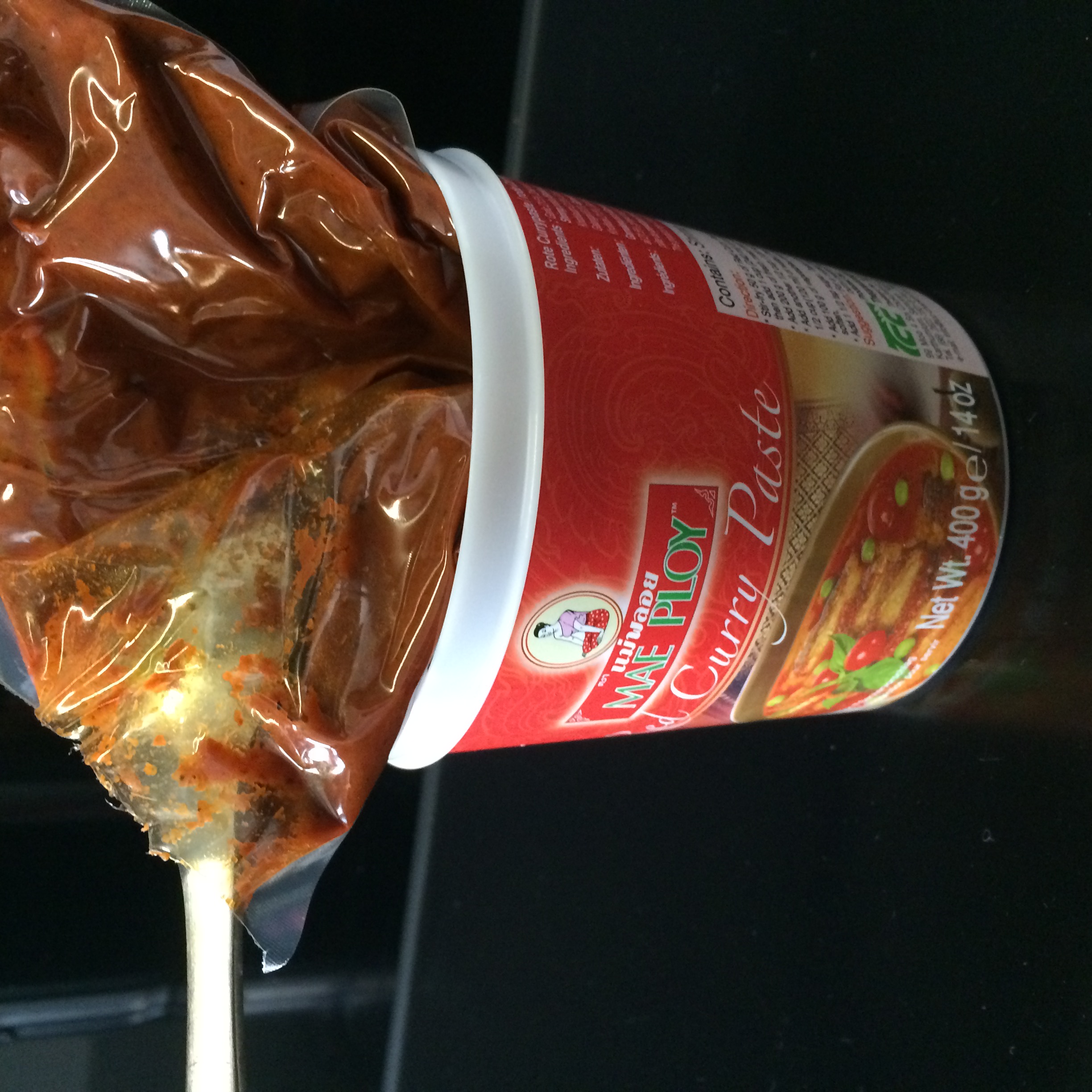 • in een andere pan of pot giet ik een blik kokosmelk en voeg een eetlepel (niet meer!) rode currypasta toe