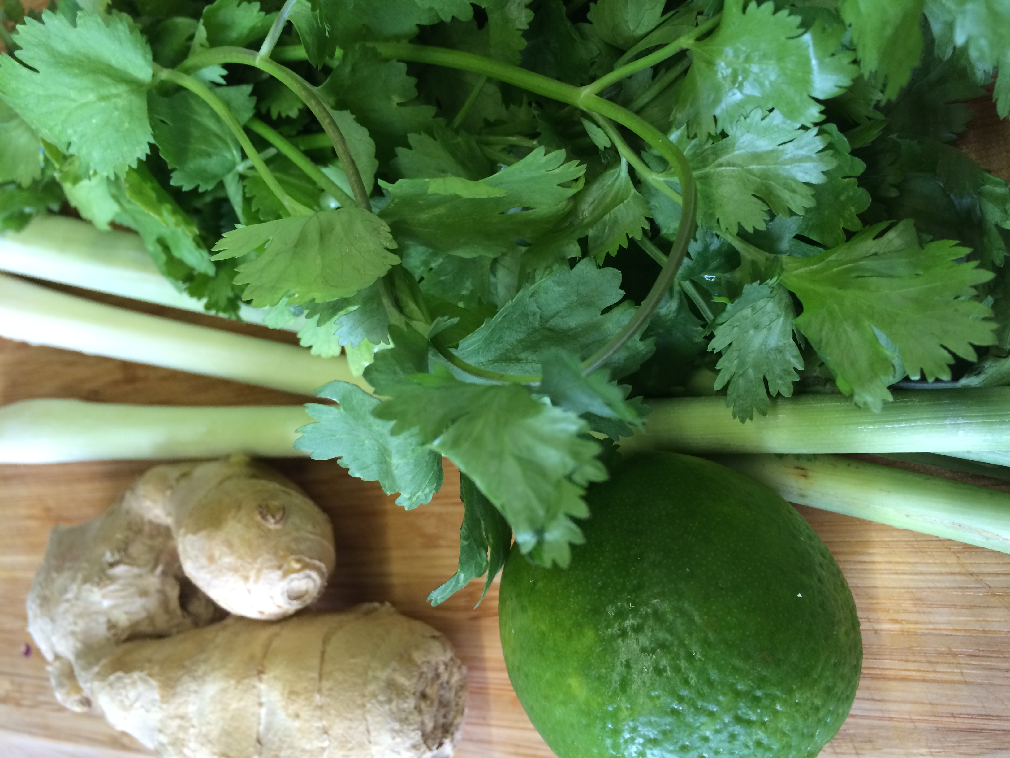 • voeg de groenten bij de kokosmelk/curry/garnalenpasta, schil en snij de gember fijn, verwijder de buitenste bladeren van citroengras en snij in kleine ringen, voeg koriander toe, pers de limoen en voeg het sap toe