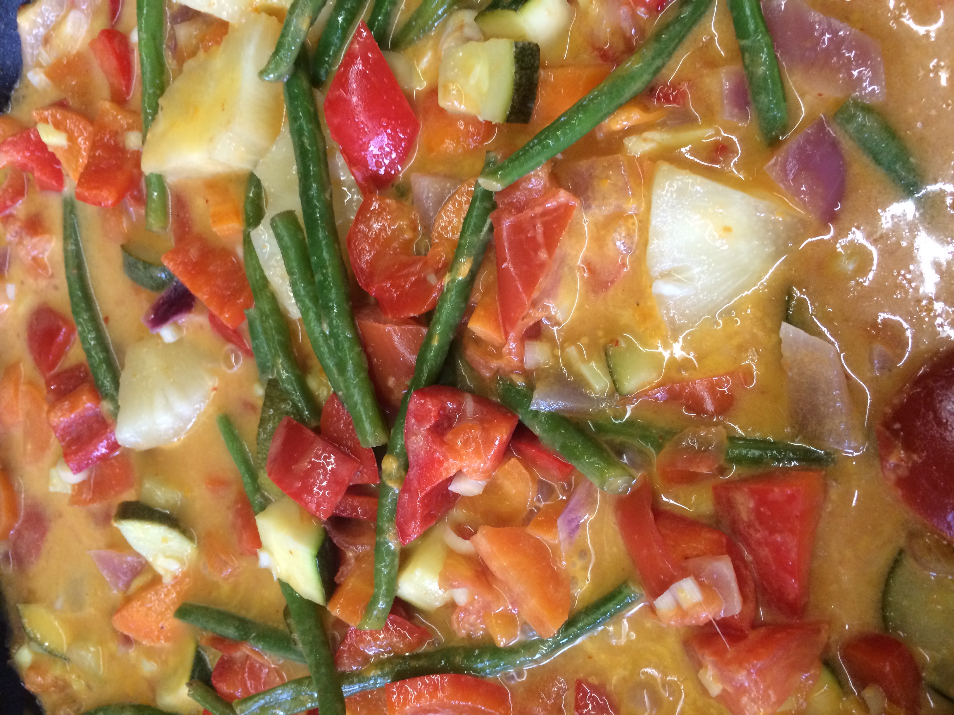 • stoof jouw favoriete groentjes in olijf-of kokosolie (rode ui, wortelen, tomaat, courgette,…); zelf heb ik apart nog wat groene boontjes gekookt;