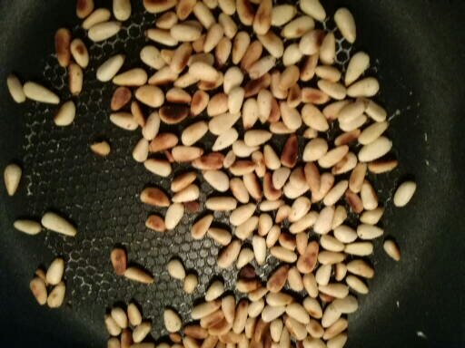 - rooster de pijnboompitten in een droge pan en hou ze opzij om te garneren