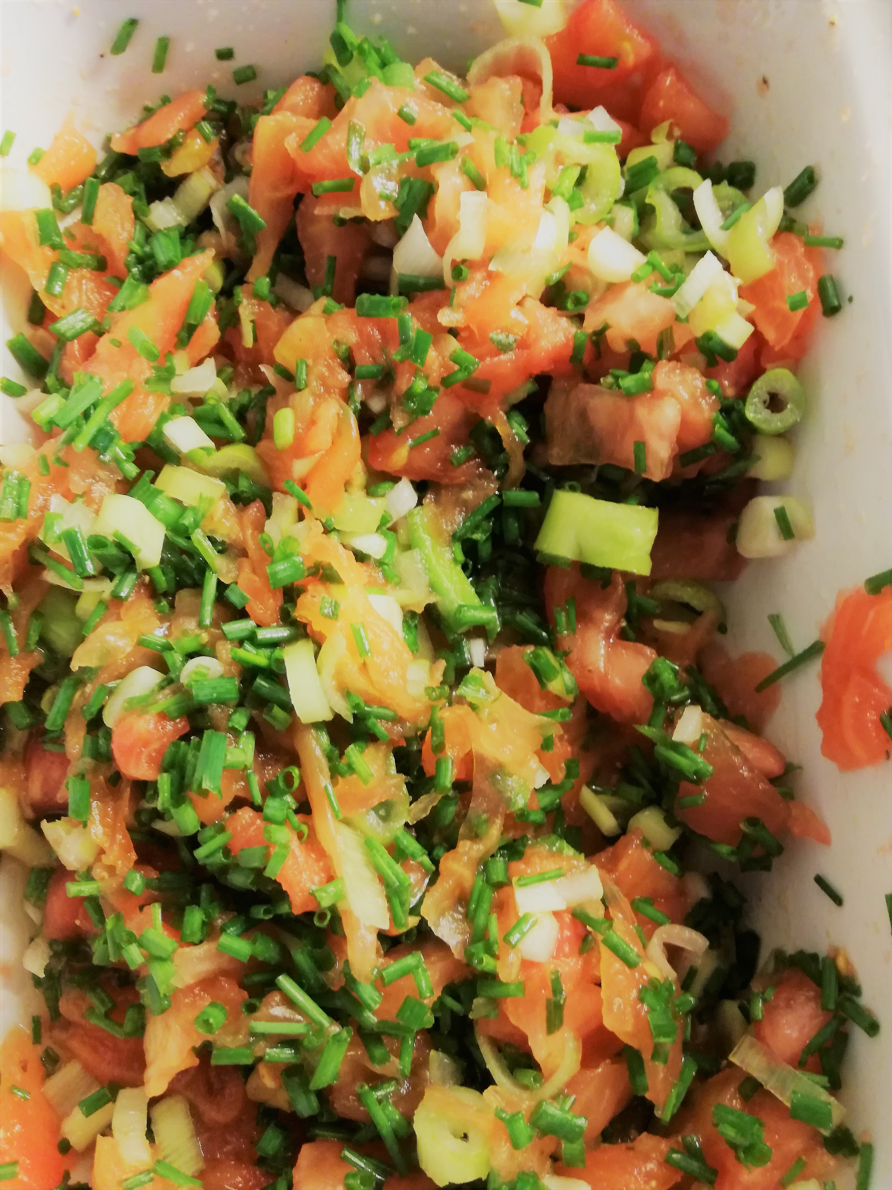 - hak de bieslook en lente-ui fijn en voeg bij de geconcasseerde tomaten