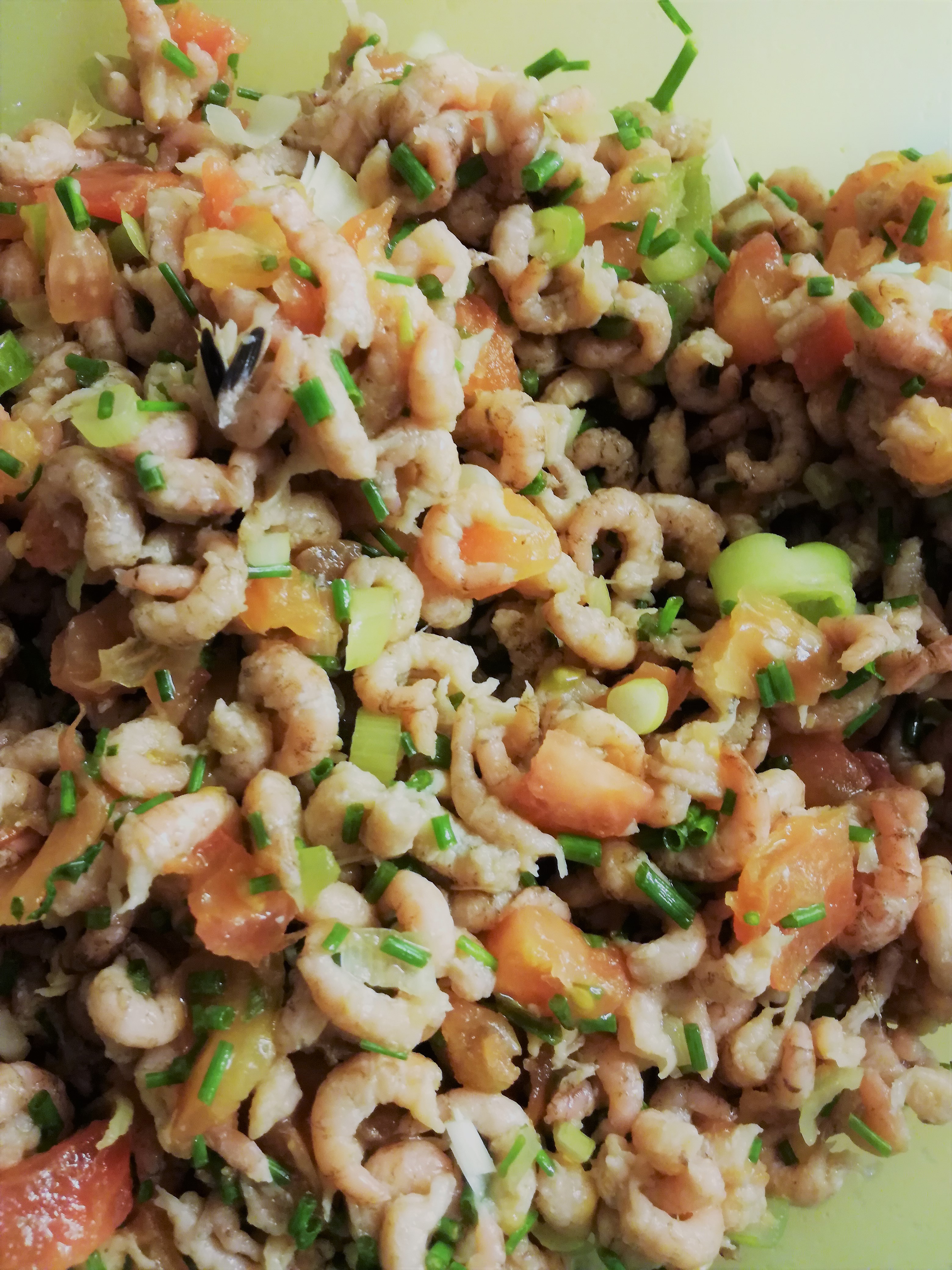 - meng de grijze garnalen eronder