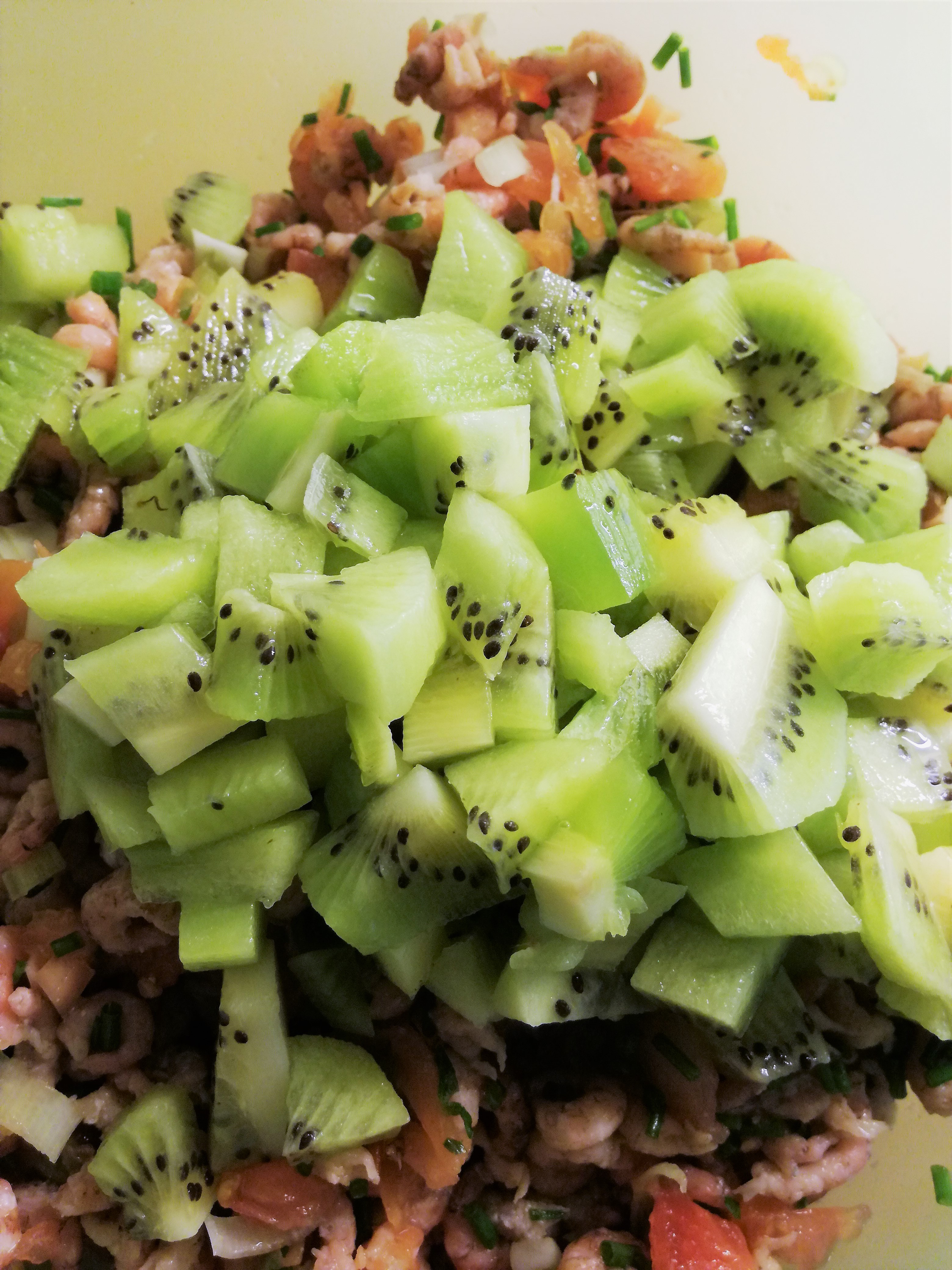 - pel de kiwi’s, snij in stukjes en voeg bij de garnalen