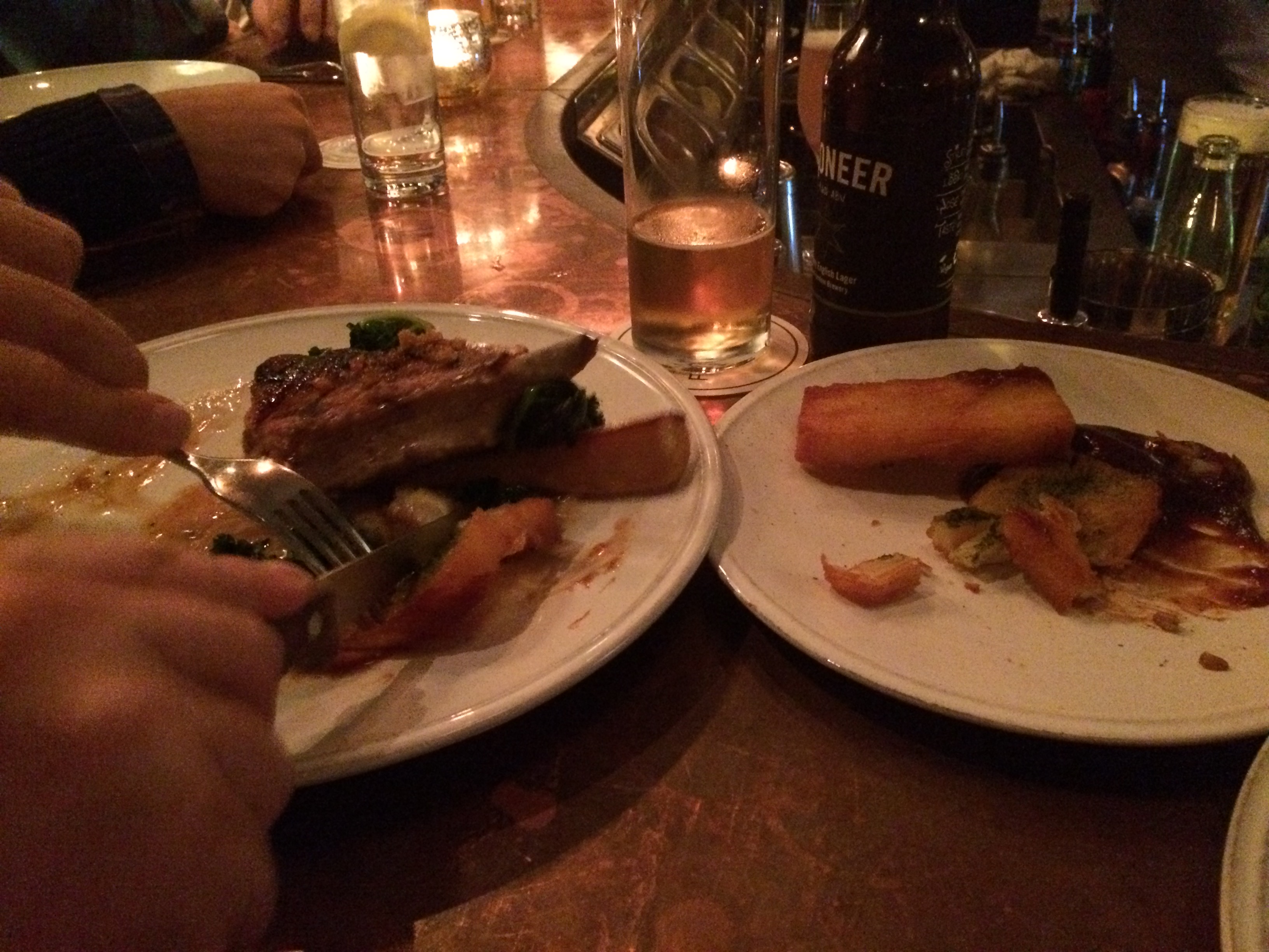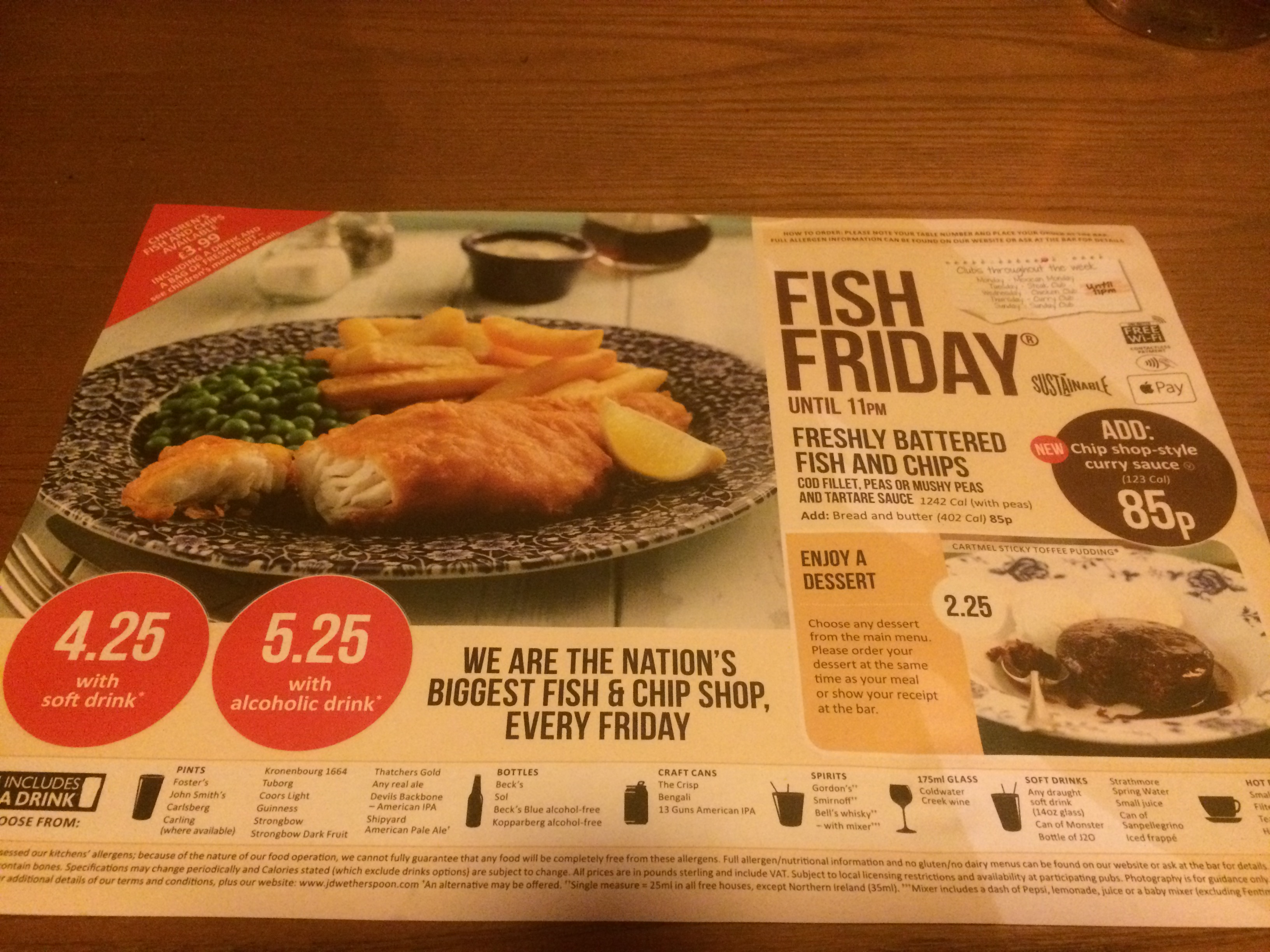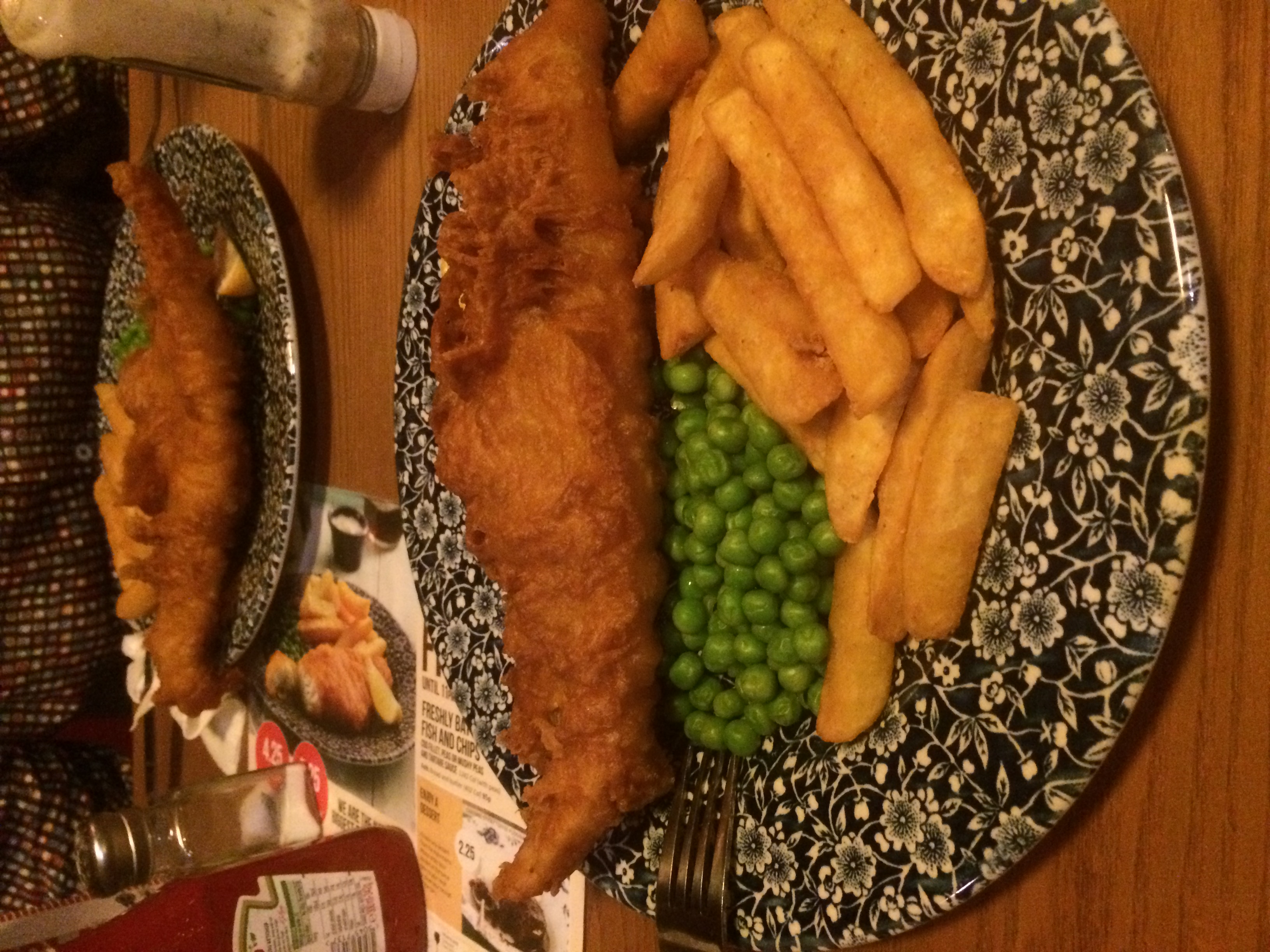 Je kan er niet omheen: hét nationaal gerecht van de UK, dat ze gelukkig niet meer in krantenpapier verkopen (JUK!). Wij eten F&C in de enige ‘fatsoenlijke’ eettent in onze verblijfplaats in Hayes: Wetherspoon – een goedkope, wat ouderwetse keten.