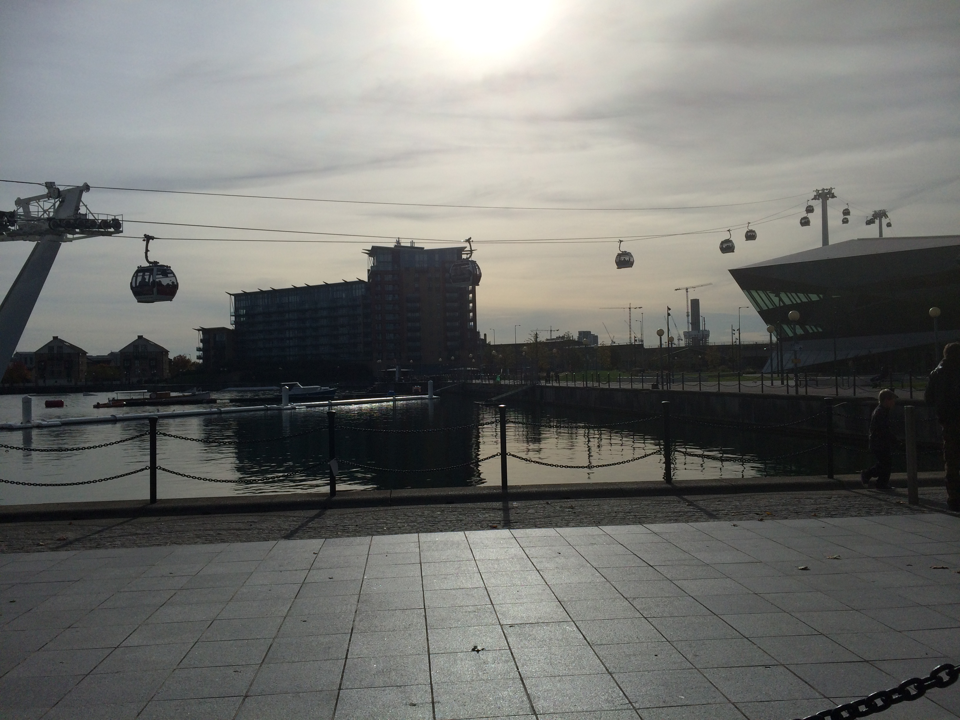 Voordat we instappen in de Emirates Cable Car zijn we aangenaam verrast dat we in een leuke buurt terechtkomen. Het stralende zonnetje geeft nog een extra motivatie om buiten een ‘burger’ te verorberen met zicht op de watersporters. Onderweg hebben heel wat ’tube’-reizigers ons doen lachen en fronsen… Verkleed als Manga-stripfiguren, Star Wars figurant, krijgers en … ja, als wat nog??? Mijn nieuwsgierigheid laat me bijna ontploffen en een wat Victoriaans uitgedoste dame geeft ons eindelijk uitleg.
